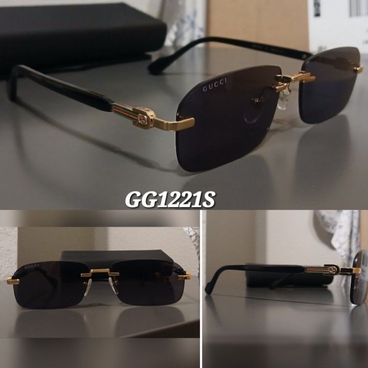 Gucci sunglasses. Model # GG1221S. Black and gold flex frames. Like new, In excellent condition. Authentic. Comes with box, case, dust cloth, and bag. Authentic