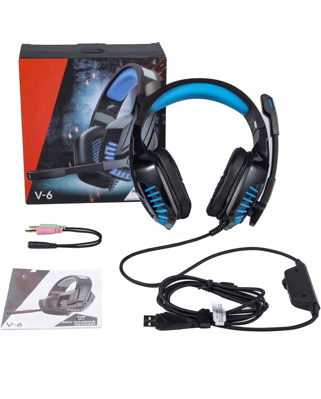 3.5 MM Gaming Headset, Detachable Noise Reduction Microphone, Headset with 3D Surround Sound Memory Foam Ear Pads LED Light,Ergonomic Design(Black Blue) 7-cang-1