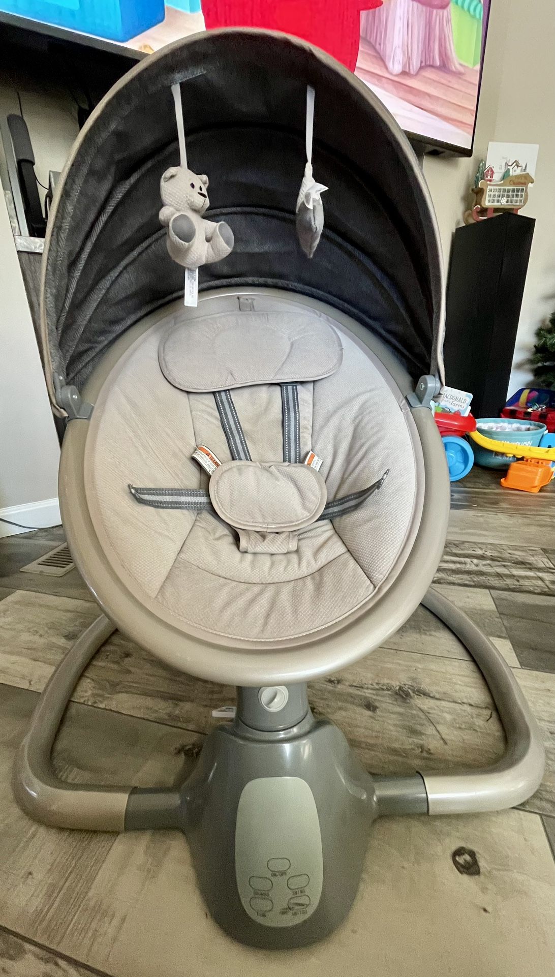 Everything seen in picture is included. Like new baby swing! Collapsable to store under bed! Very soft material, buckle baby securely into swing, canopy with toys, control either from base or via remote (i attached the remote to the back of the base with velcro so it cant get lost). Retails for $100! Asking for $70 since theres nothing wrong with it. **Pickup only**
