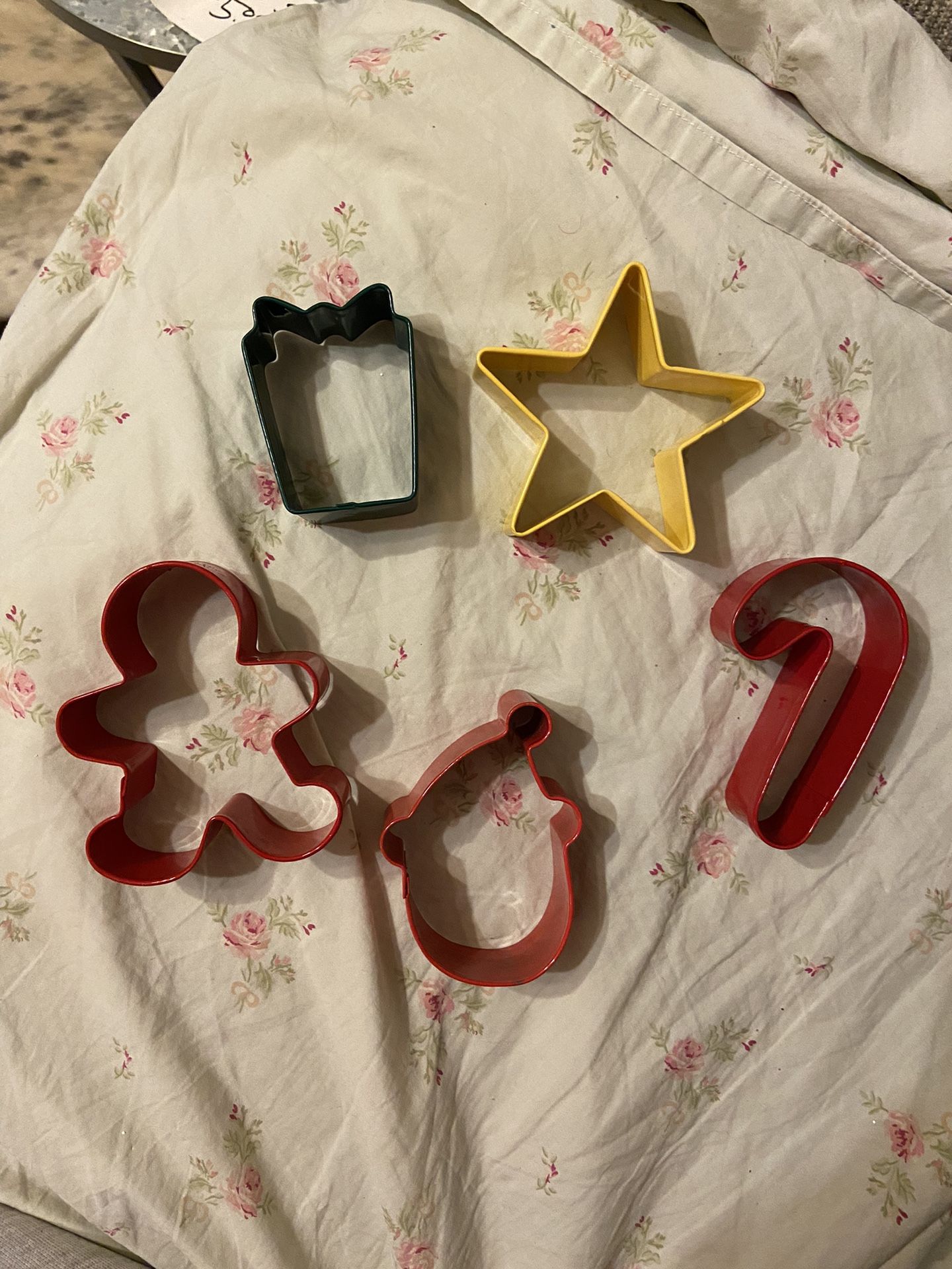5 cookie cutters (3 red ones, 1 yellow, 1 green).. A Candy cane, Santa w/hat, gingerbread man, gift and a star cookie cutters.. pick up in Kyle, cash only, $12 for all or better offer..