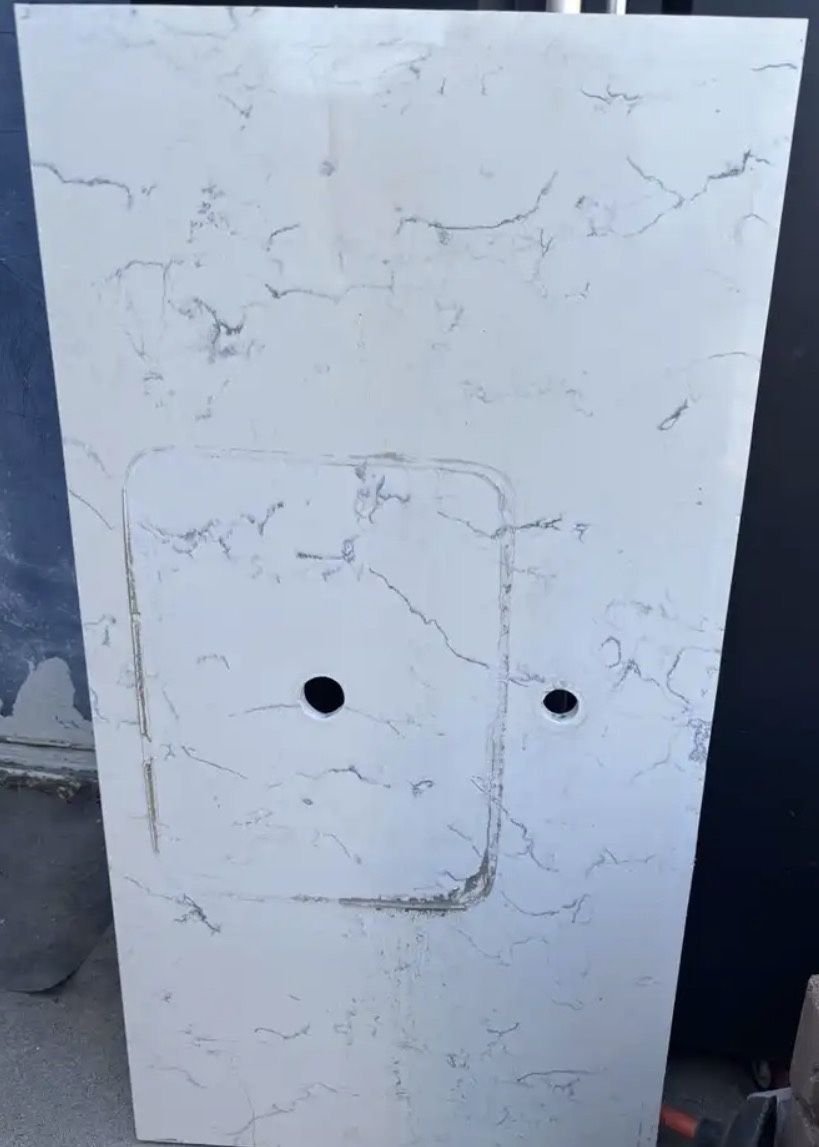 Quartz countertop with sink cutout holes for faucet and drain. 6” back splash included 23 1/2 x 44 1/4 Backsplash is 6 x 44 1/4
