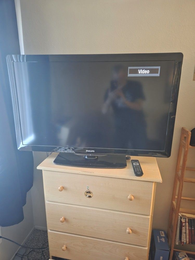 Philips 40" tv. Perfect picture, no missing pixels. Only thing is the battery cover on the remote is missing. Otherwise, it is a perfect bedroom or studio tv. Works good with gaming consoles also.