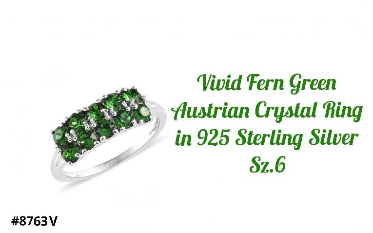 Beautiful vivid green color, double row of Austrian crystals, set in 925 sterling silver. Size 6. Comes with gift box.