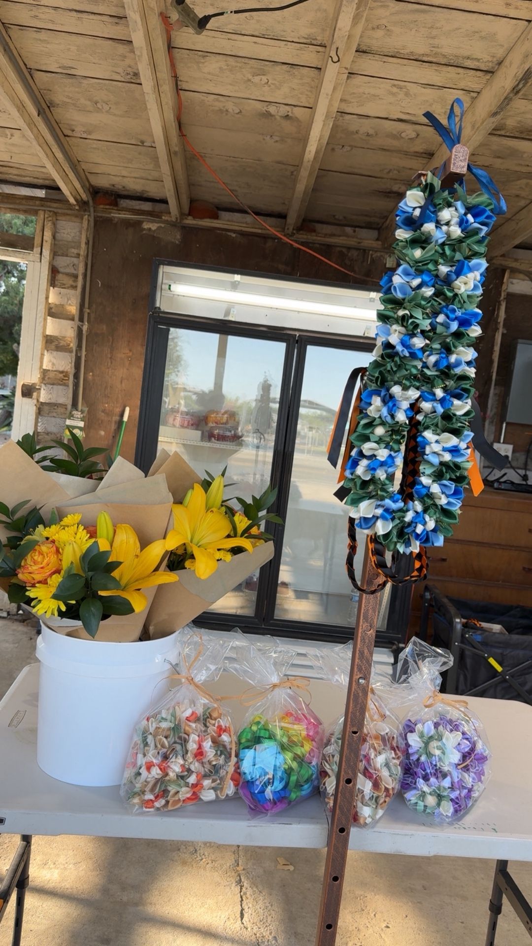 The flower stand is located in the corner of rose and bethel in Selma. We have ribbon leis, fresh flower leis and bouquets available for purchase. Hablo español