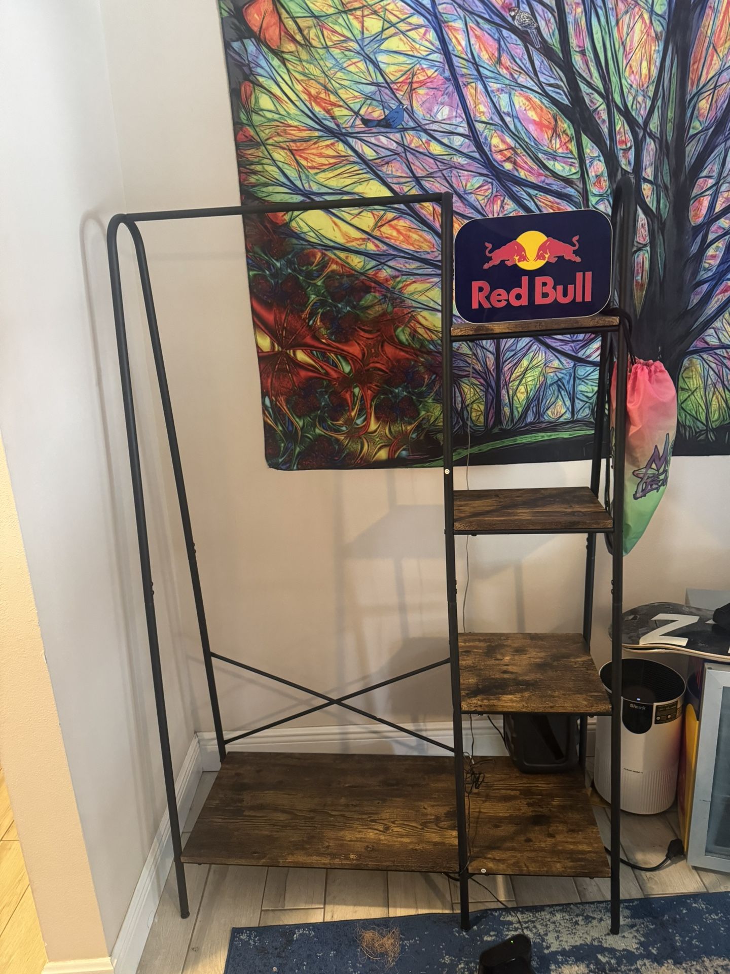 Used as a jacket/coat holder. With shelving. Color is brown and black. Perfect condition.