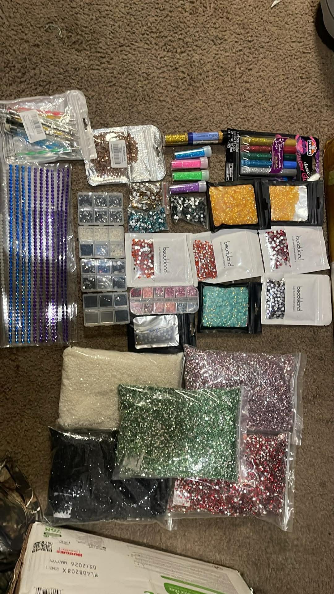 Various size rhinestones large bags and regular size bags with glitter sticks and tools for rhinestone placement some bags opened