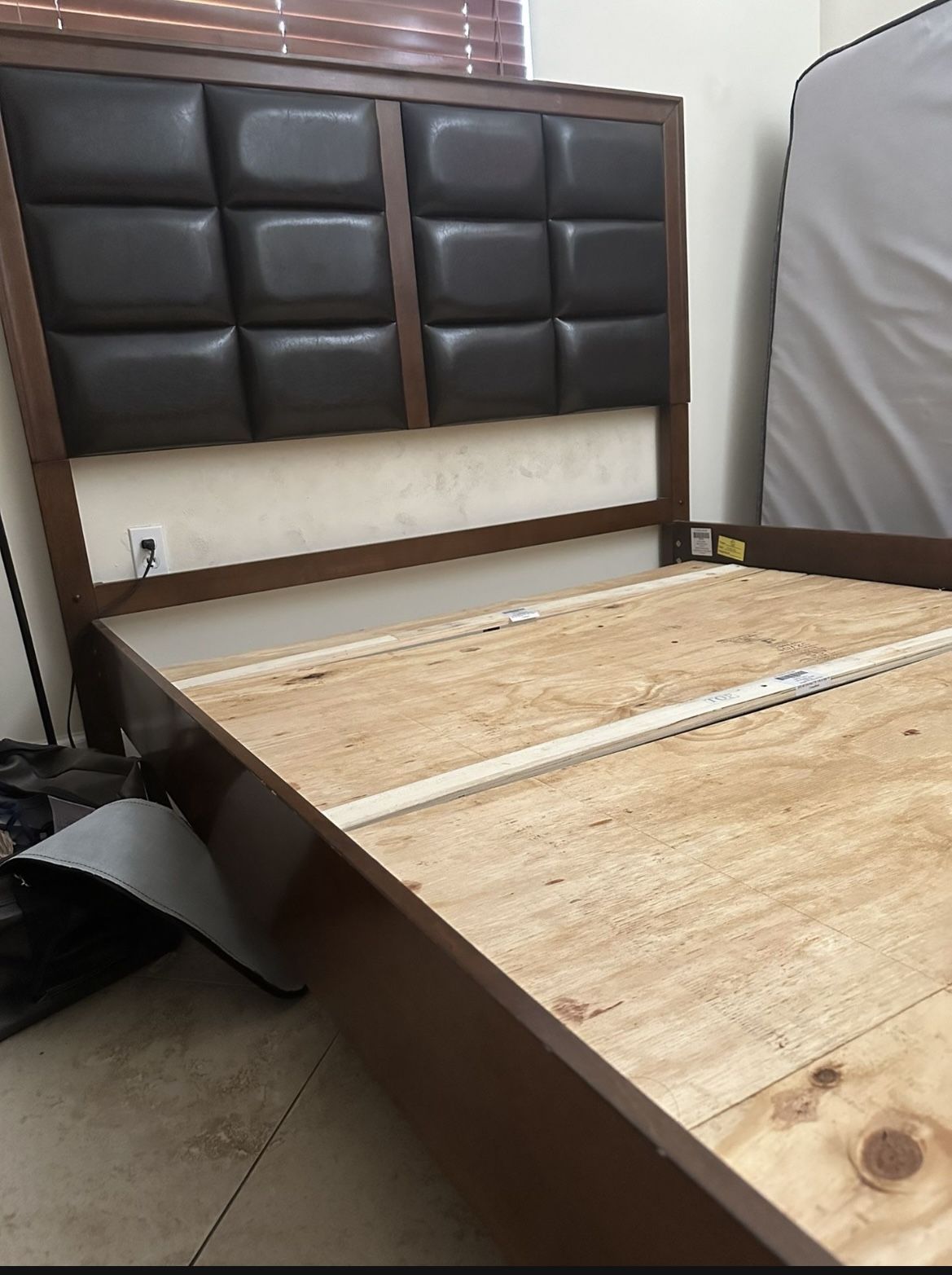 Wooden Queen bed with leather backrest. No box spring required. Comes with wooden planks as shown in photo to support the mattress. In very good condition.