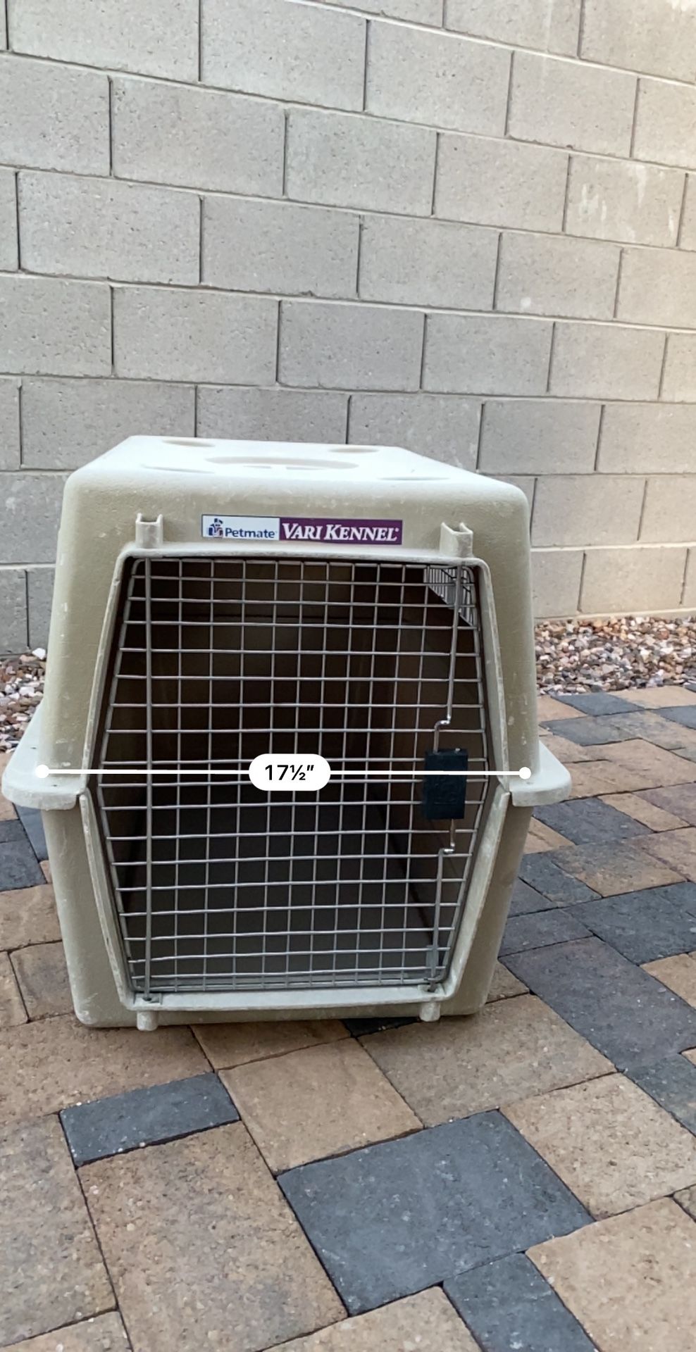 This is a medium size dog crate by VariKennel. It is in good shape, with no structural faults, but we misplaced the thumb screws to hold the top and bottom together. You will have to buy those separately.