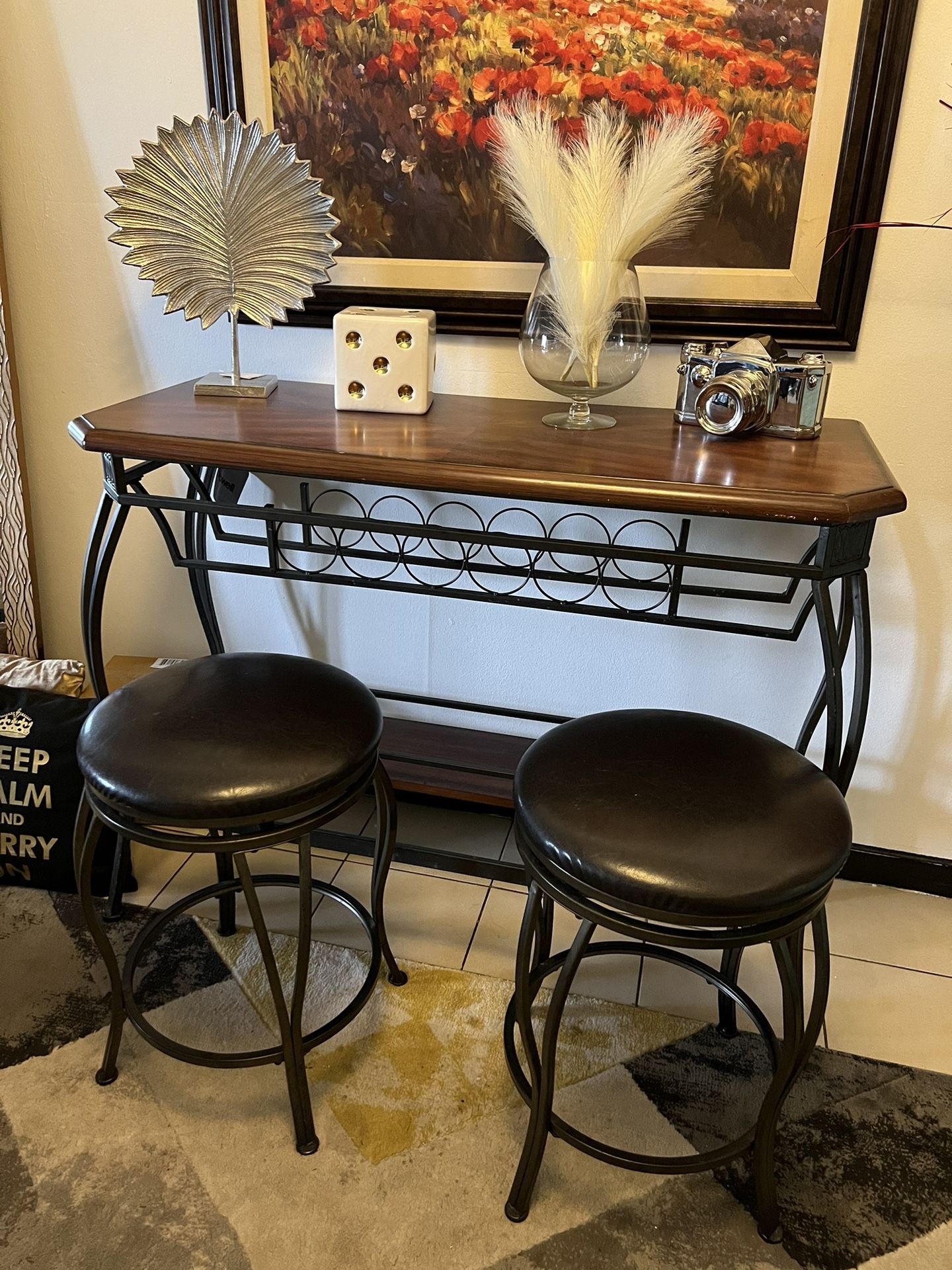 This is a beautiful bar table with the wine rack. It’s kind of hard to let go of. It is in very good condition good, some normal wear and tear. I promise you’ll love it.