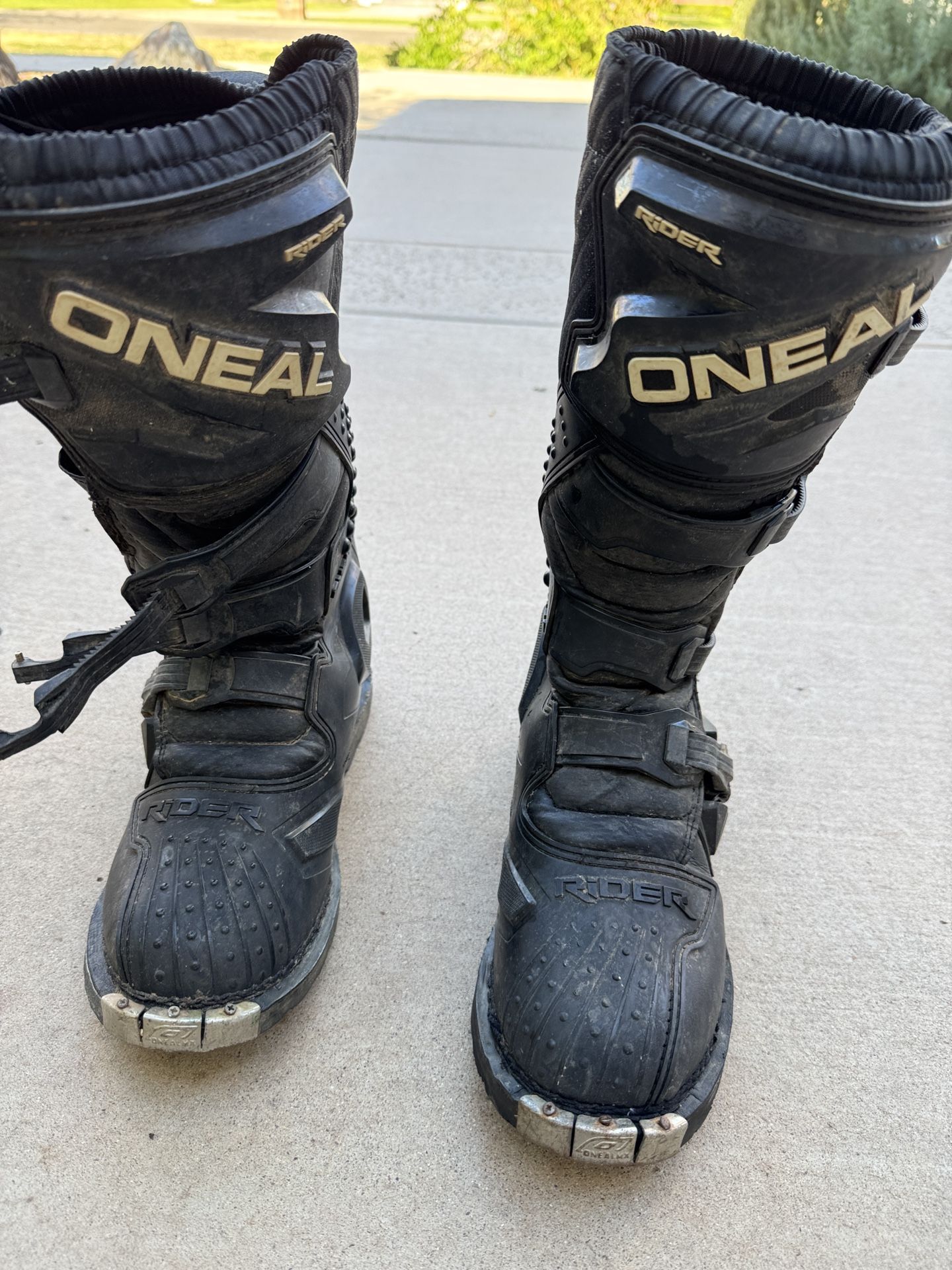 For sale is a pair of O'Neal Rider motocross boots in Men's Size 10 (EU 43). These are solid, entry-level boots perfect for trail riding or the track. Details: • Brand: O'Neal • Model: Rider •: US Men's 10 / EU 43 • Color: Black • Condition: Good used condition. They show normal wear from riding (scuffs and some dirt), but the soles are in great shape with plenty of life left. • Features: All snap-lock buckles are intact and functional. Includes the original metal toe guards for added durability. Great boots for someone looking for solid protection without paying full retail price.