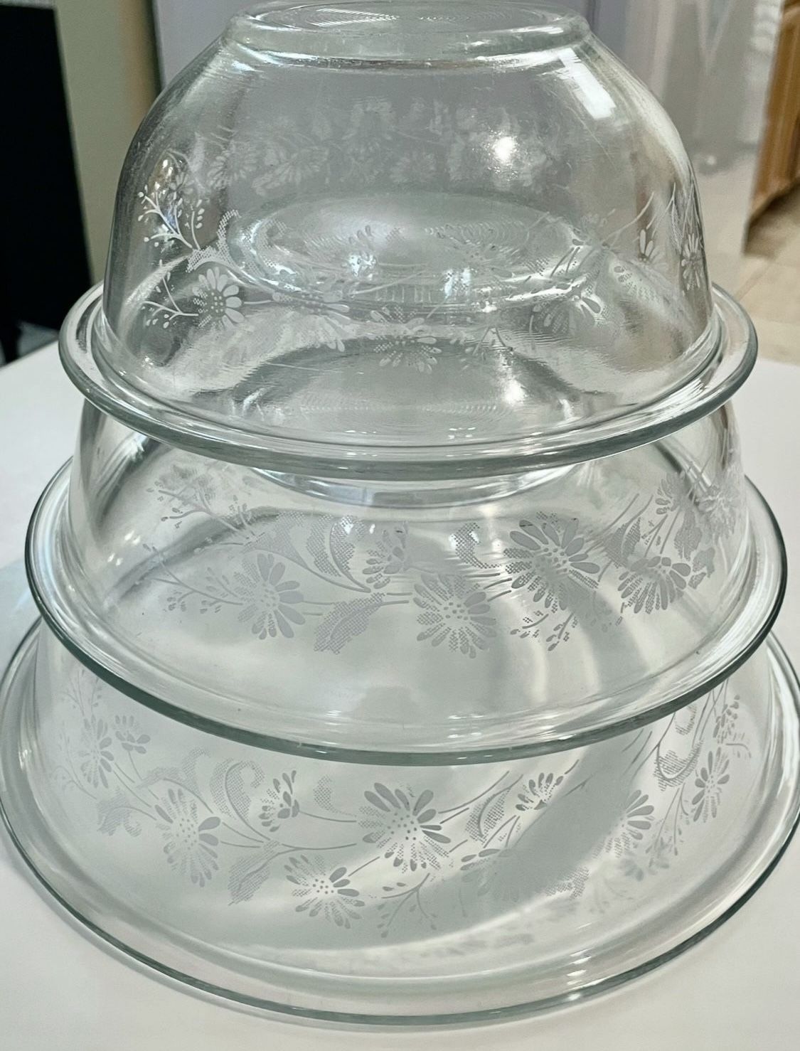 Set 3 Vintage Pyrex Clear Colonial Mist Nesting Mixing Bowls White Lace Daisies 325, 323, 322 Price Is FIRM