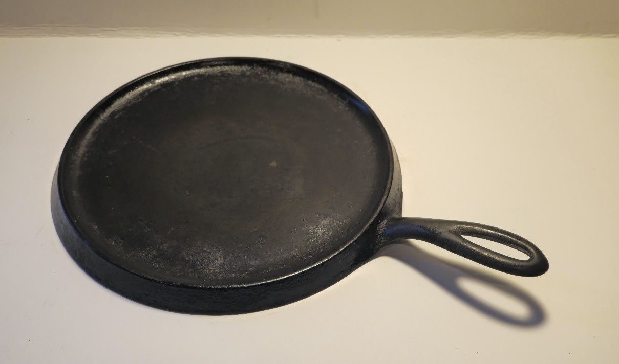 The Griswold 9" Cast Iron Cooking Plate is a skillet made of cast iron in the United States. It is designed for cooking and features a 9-inch diameter. This collectible metalware piece is durable and ideal for various cooking tasks. Comes with detachable handle.