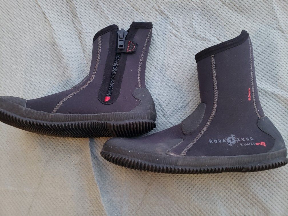 2 pairs of neoprene dive boots: Aqua Lung Super Zip Ergo, 6.5mm, men's size 11- $35 Deep See Thermoflex, 6.5mm, men's size 11, - $25