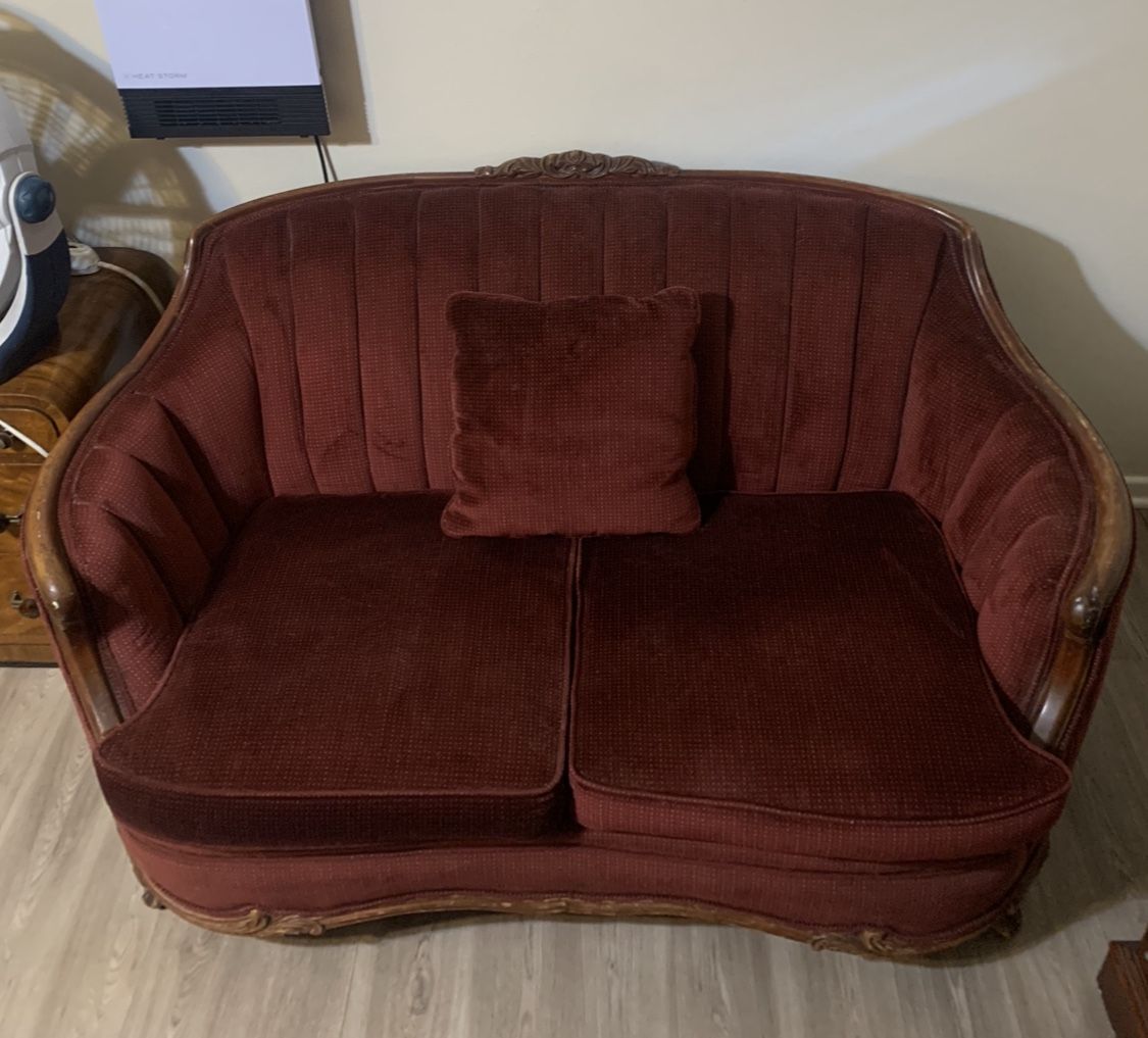 Vintage, burgundy sofa, with one through pillow. Check out photos, for actual size.
