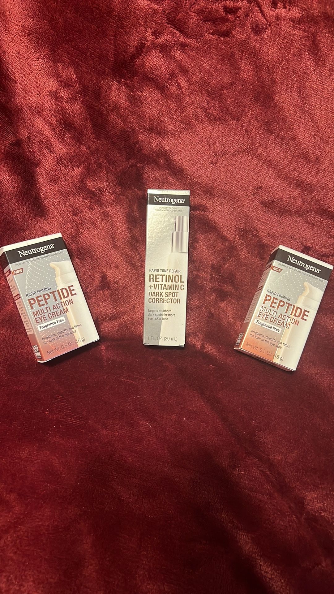 *** Brand New Unopened Still Sealed *** Neutrogena Rapid Firming Peptide Multi Action Eye Cream, 0.5 OZ x2 Neutrogena Rapid Tone Retinol + Vitamin C Dark Spot Corrector, 1 OZ x1 Retails for $51 + - Bundle of 3 - Smoke/ Pet Free - Carefully Packed and Shipped With Care - Shipped Within 1 Business Day - Thanks!