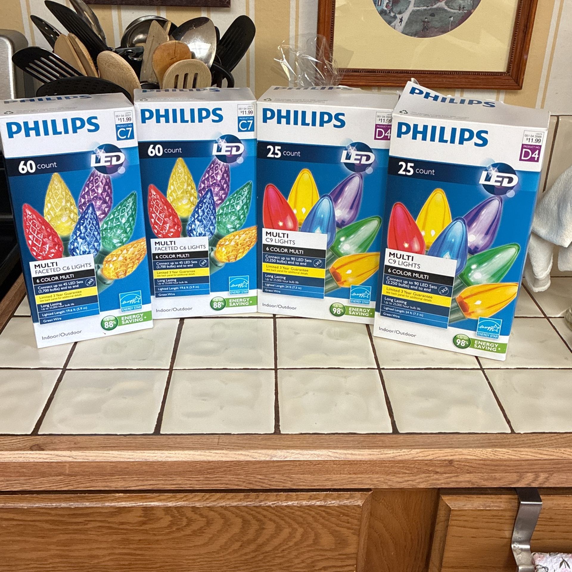 2 boxes 60 count LED lights 19.6 feet Indoor/Outdoor. 2 boxes 25 count LED lights 24 ft. Indoor/Outdoor string lighys