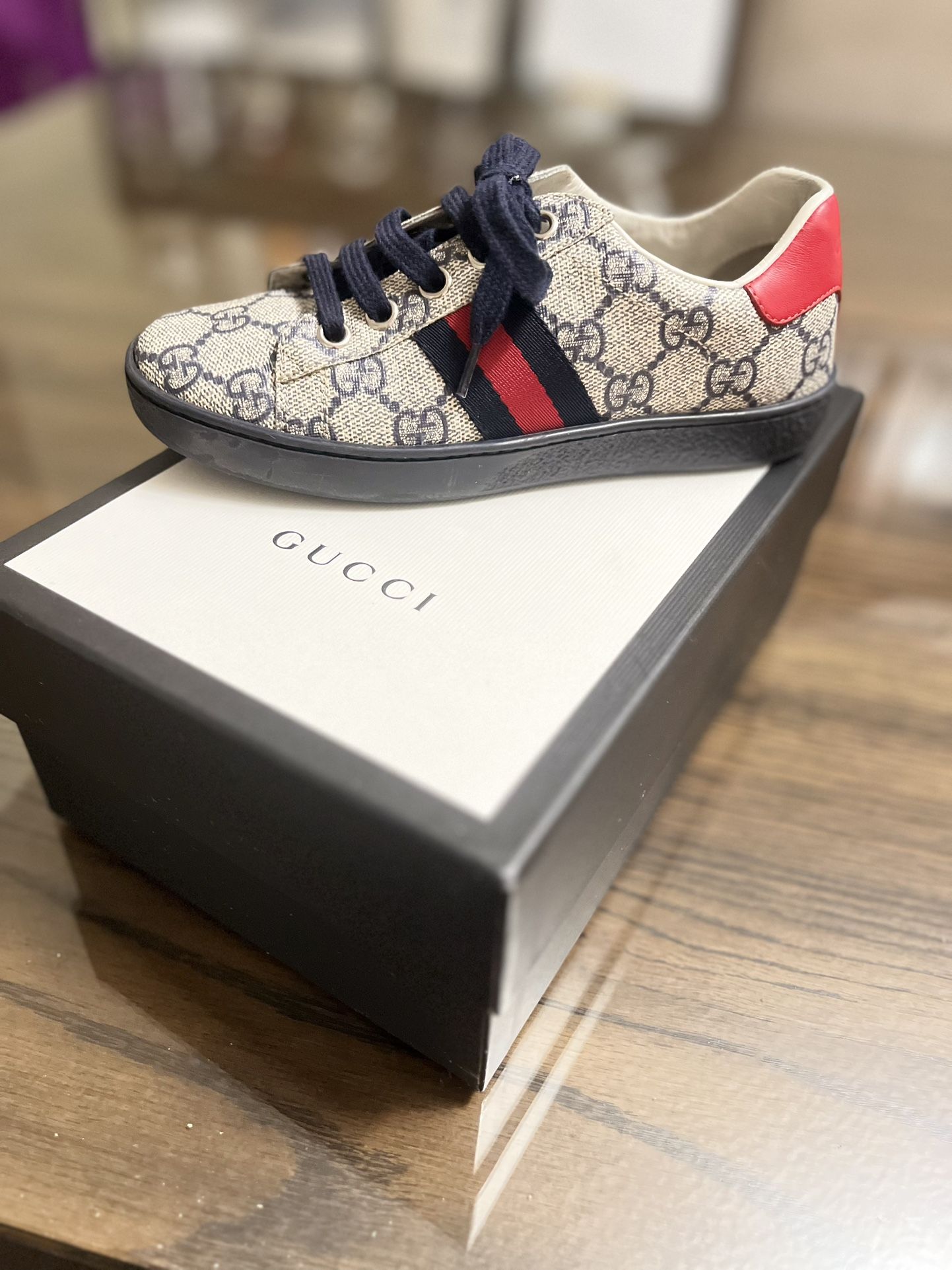 Gucci Sneakers Size 31 European (13.5-1 US) Navy Blue with logo stitch, red and navy blue stripes Used but in very good conditions. Dm if interested saving up for ebike