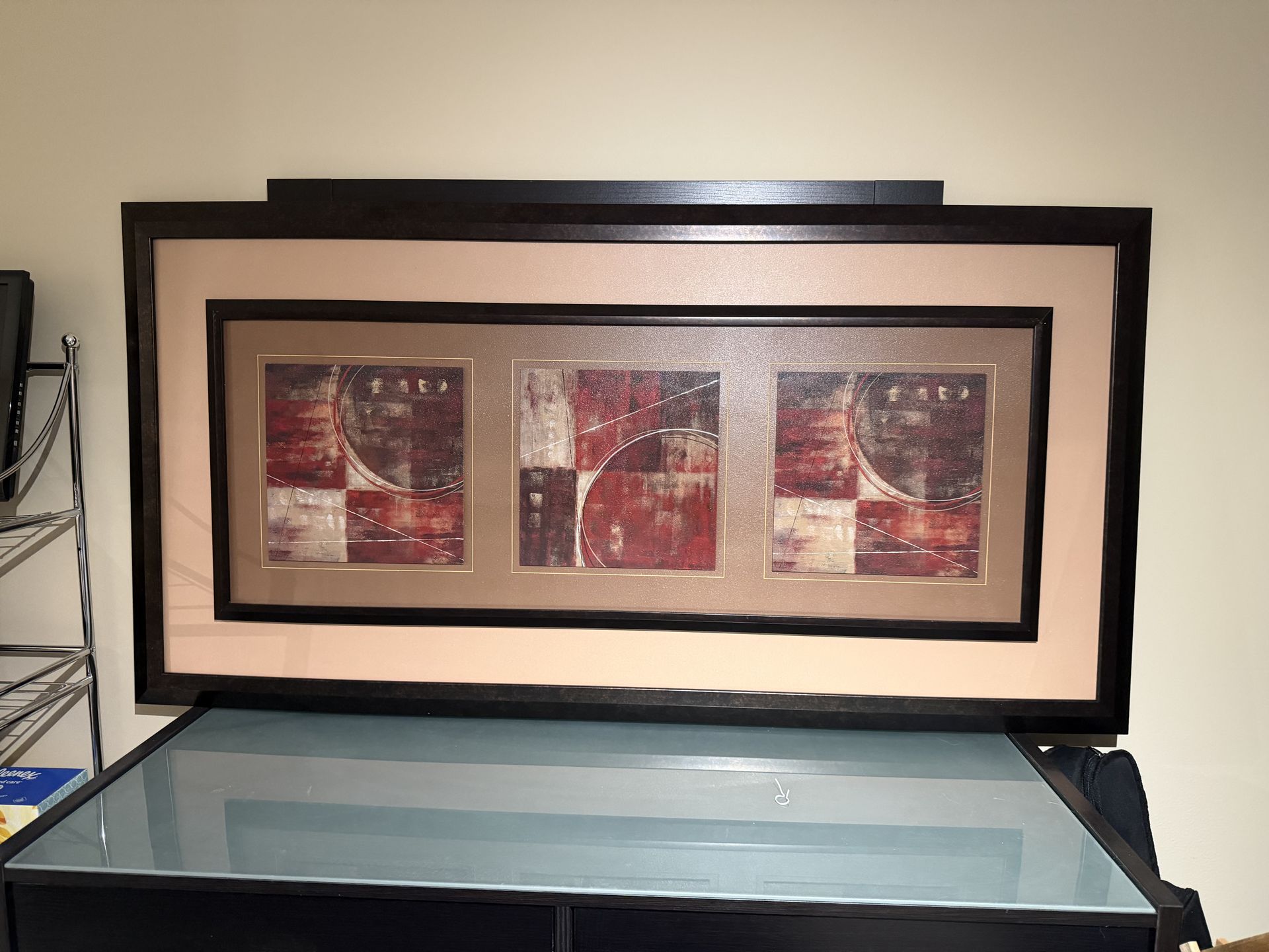 Beautiful large framed abstract wall art in warm red, gold, and neutral tones. Modern design that fits perfectly in a living room, bedroom, hallway, or office. • Size: 61 x 31 inches • Elegant dark frame • Contemporary abstract style • Excellent condition Adds a stylish modern accent to any space. Pickup in Hallandale