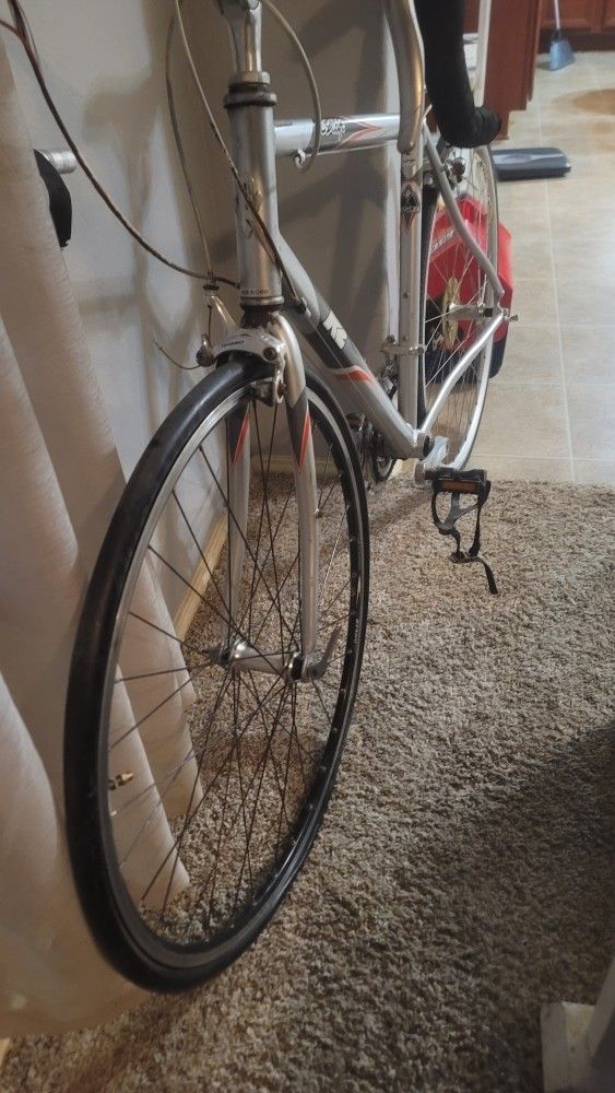 KHS Escape road bike , front and rear derailleur s are good , stuck in one gear bc needs cables , still ridable as is , 24 spd 21inch frame after market Alexrims front rims , thick slick tire . Aluminum frame.