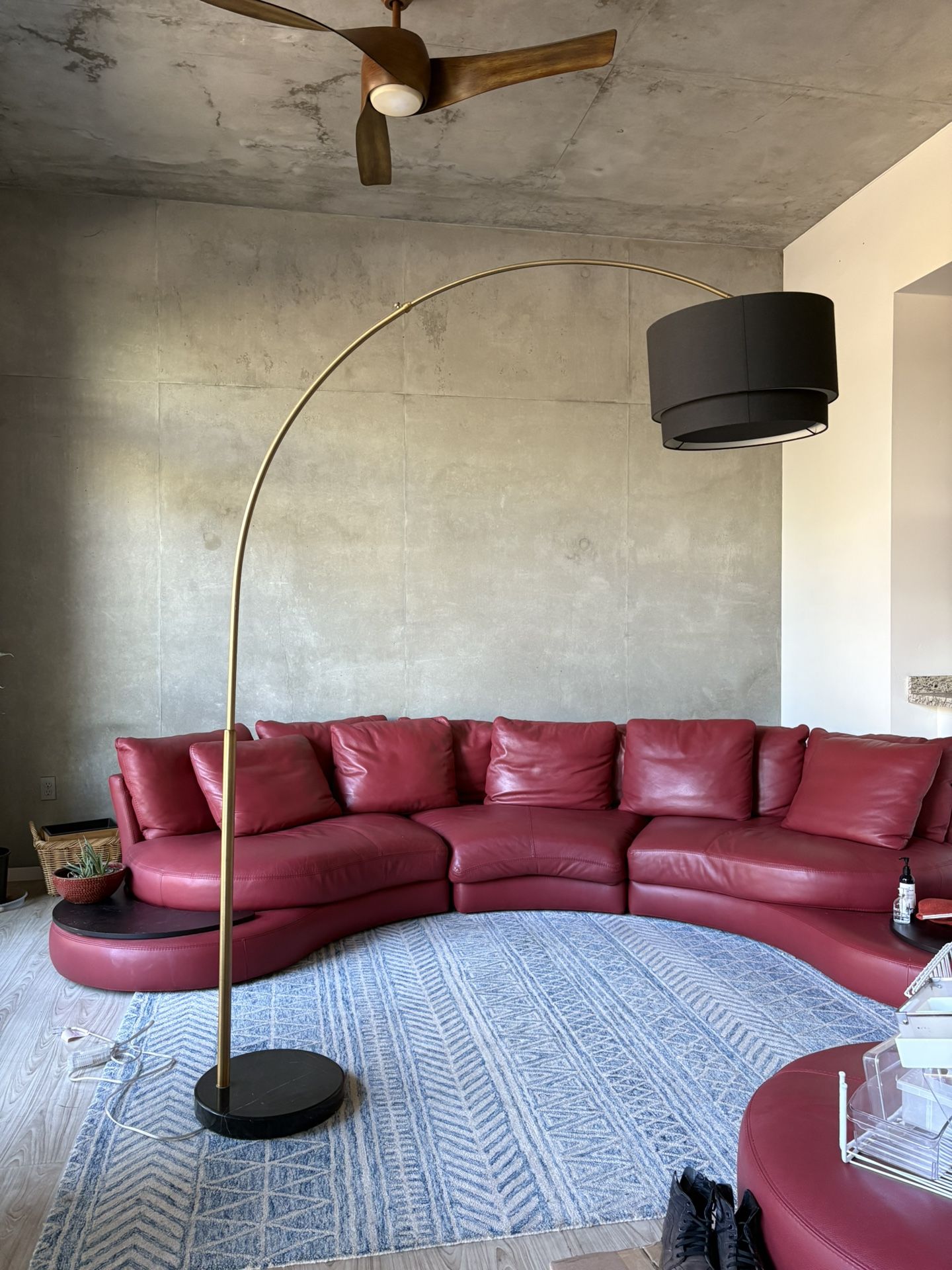 This lamp is definitely a statement, we’re sad to let it go but it won’t work in our new apartment. I love that the light is soft and tolerable even when you’re underneath it because of the way the shade is designed. Dimensions: 7’1” tall from the highest point of the arch. 5’2” wide from the middle of brass pole to the edge of the lampshade. The base is 15” in diameter.