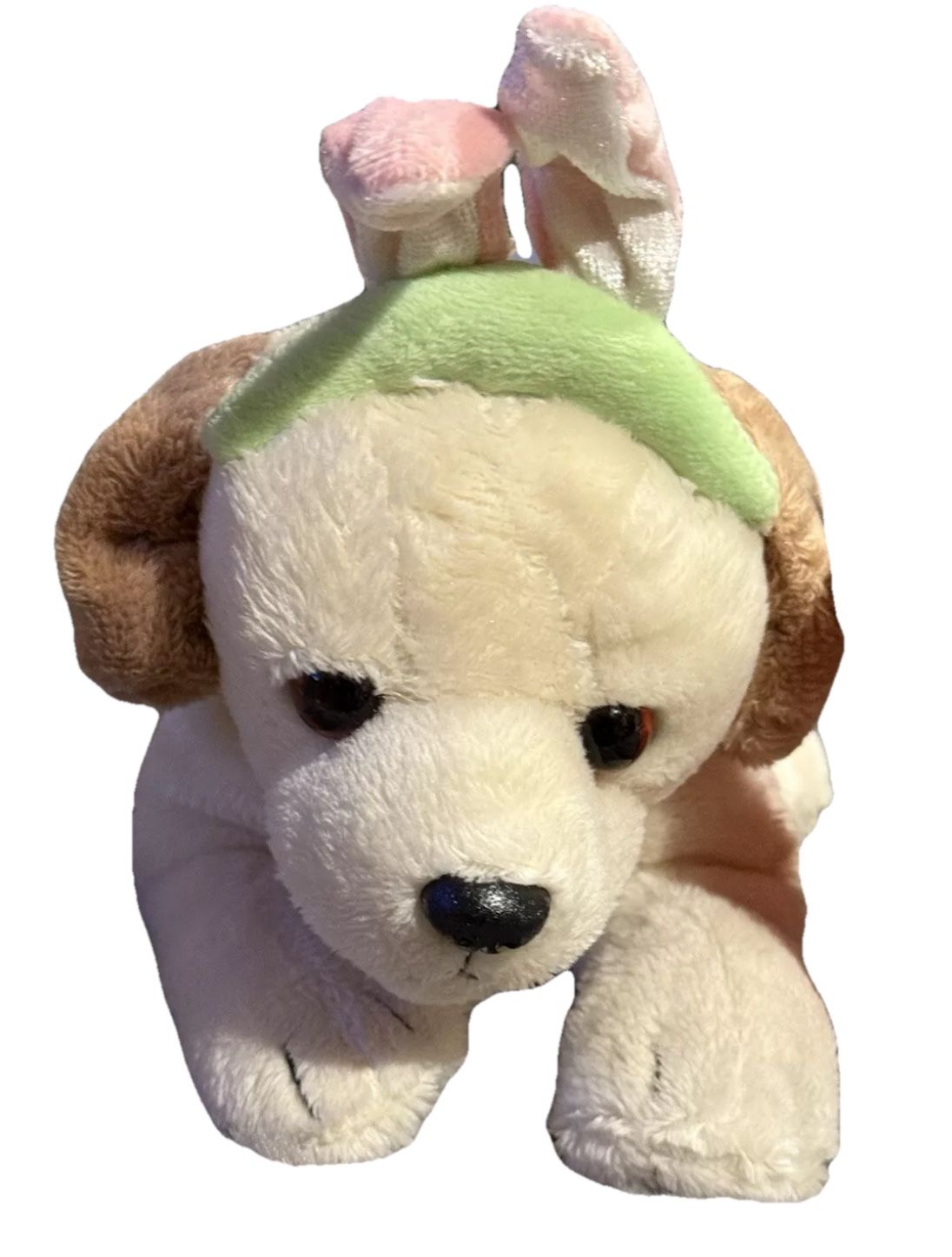 Plush Yellow Labrador Retriever w/Bunny Ears Easter Puppy Dog w/Print Bow NWT So cute. So soft, so lovable. He will sit on your desk and behave himself. He never asks to go out, no need to walk him, no maintenance, no additional stress or costs after you bring him home. He’ll just cuddle up with you. Beautiful big brown puppy dog eyes with a plastic little nose. He has a blue floral bow around his neck. He has beautiful coloring off white body with light brown ears and tail. He has a few beans in his paws, and a few in his belly and but. Soft and cuddly. Measurements: * From tail to nose :9.5” * From bunny ears to paws: 6” * From puppy to paws: 4” Contents: * polyester fibers * Plastic beans * & Coated wire stifteners * All new materials Made in China UPC: (contact info removed)91 Brand New with Tags Washing instructions on Tags Comes from a smoke free/pet free home. Ships within one day of purchase. If you have the ability to pick up the stuffed plush bunny puppy dog , we are happy to meet you, so that you can save money. You can pay us when you pick up the plush bunny puppy dog .