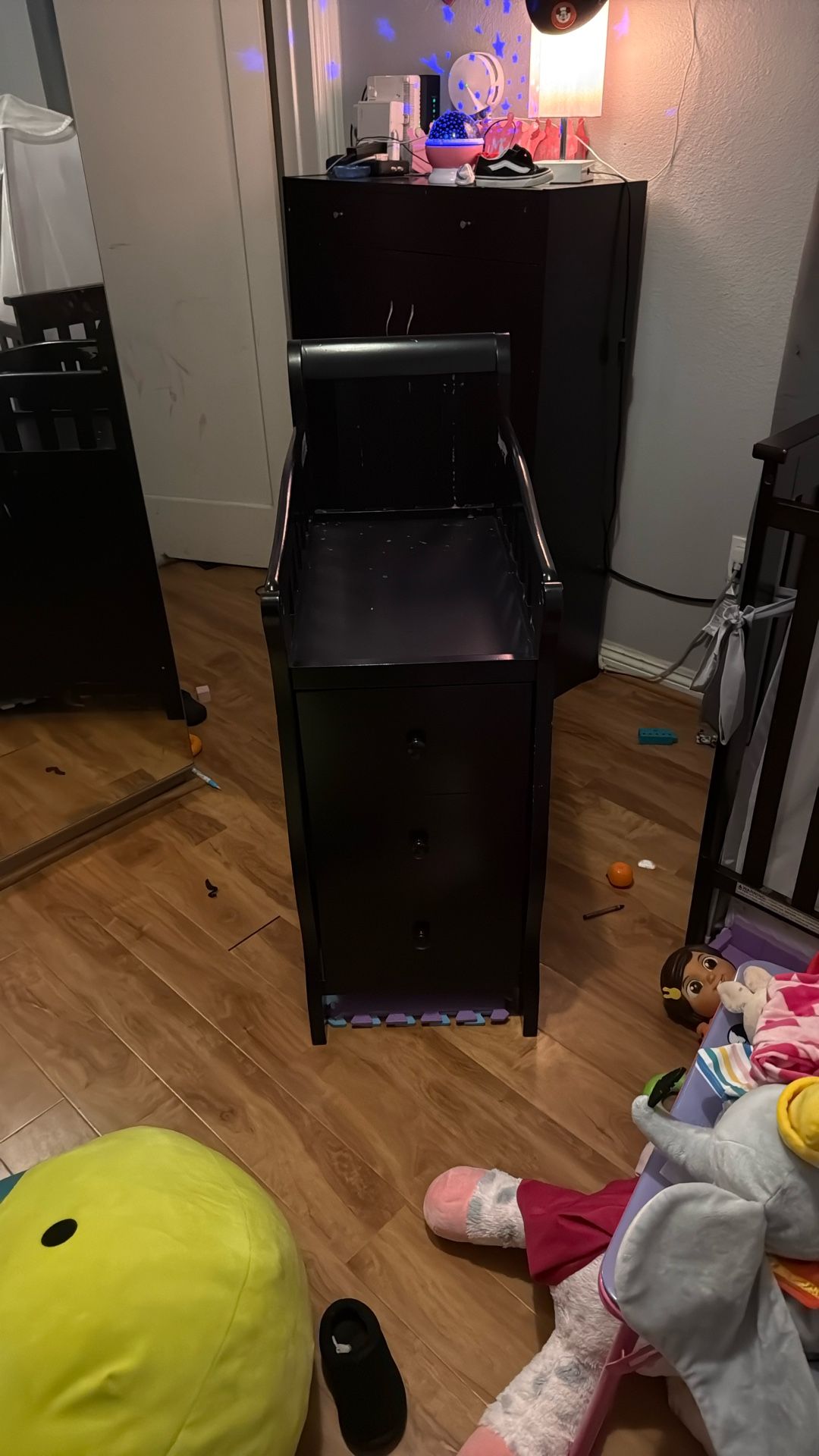 has a flat diaper change area, back serves as 2 shelves, includes 3 working drawers great condition! baby toddler crib diapers change nursery wood