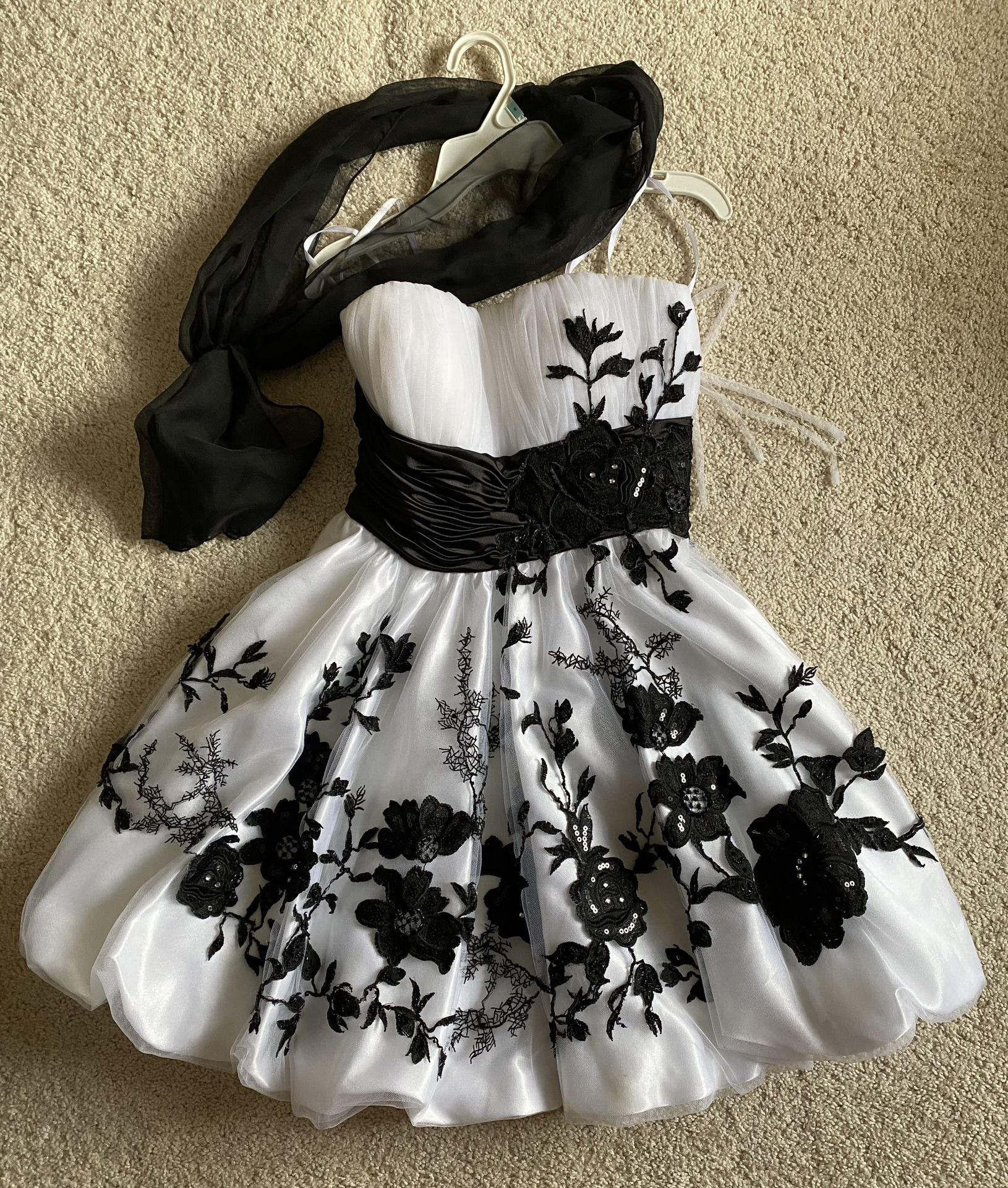 Short, Sleeveless White Prom Dress with Black Floral Accents and Sheer Black Scarf