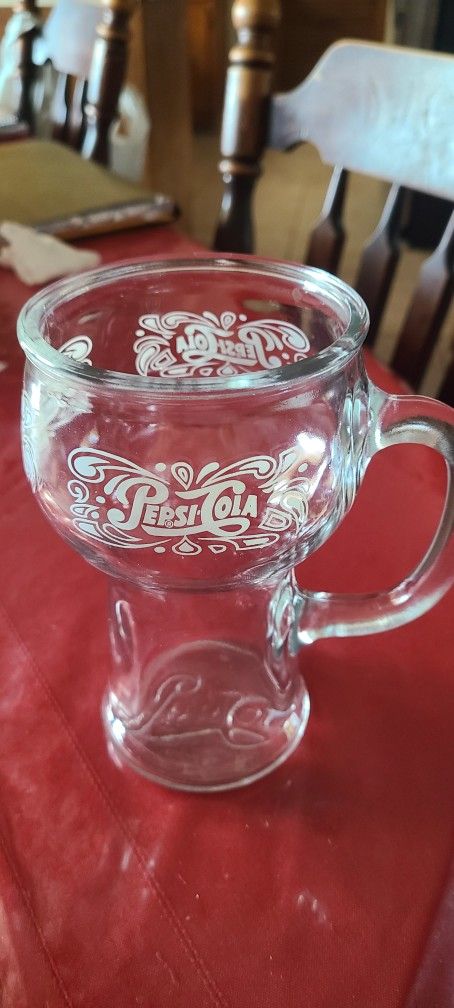 16 oz soda fountain, classic glass design. Drinking mug with handle features The iconic Pepsi cola logo With white lettering on the site and inboss logo on the base. It's a collectible item memorabilia. The mug is described as a soda fountain style glass mug with a sturdy handle.