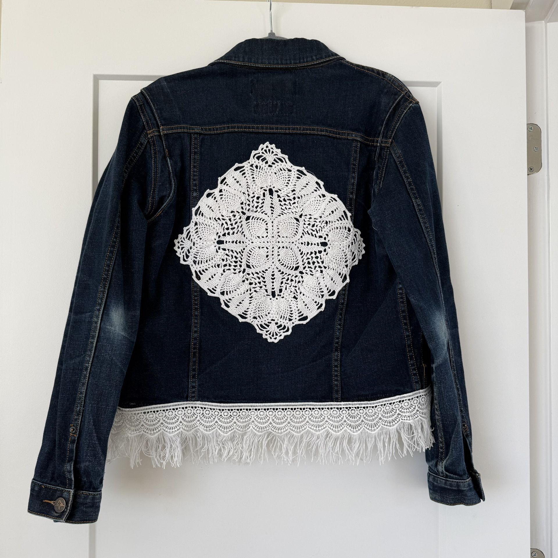Women’s denim jacket with crochet lace back and lace fringe hem. Dark wash denim with statement handmade-style crochet detail on the back. Boho-inspired design, perfect for festivals, casual outfits, and layering. Button-front style. Unique statement piece. Size: S. Used, in perfect condition.
