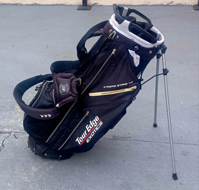 The Tour Edge Exotics Xtreme 7.0 Golf Stand Bag is a medium-sized bag with a 7-way divider system for organizing your clubs. It features a zip closure and a dual strap system for easy carrying. Made of durable polyester and nylon, this black and white bag is lightweight and designed specifically for golf enthusiasts. With a stand mechanism and a carry handle, this Tour Edge bag is perfect for transporting your clubs to the course in style. It also includes a cold pocket for storing beverages or snacks while you play. Features: - 7-way divider top with molded handle - lightweight quick-release stand - premium comfort padded double strap - waterproof accessories pocket - insulated beverage sleeve Retail $200 The bag is in excellent condition and ready to use on the course. It does not have tears or stains and does not come with a rain cover. Feel free to message me with any questions before purchasing.