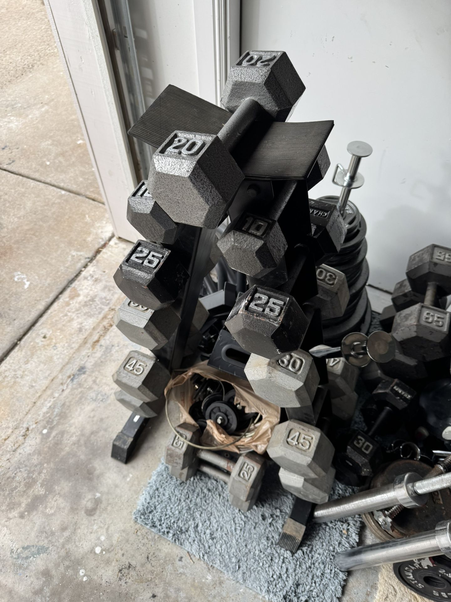 I have 340 lbs of dumbbells and a stand to hold them $325 cash firm. 2)50 lbs 2)45 lbs 2)30 lbs 2)25 lbs 2)10 lbs 1)20 lbs