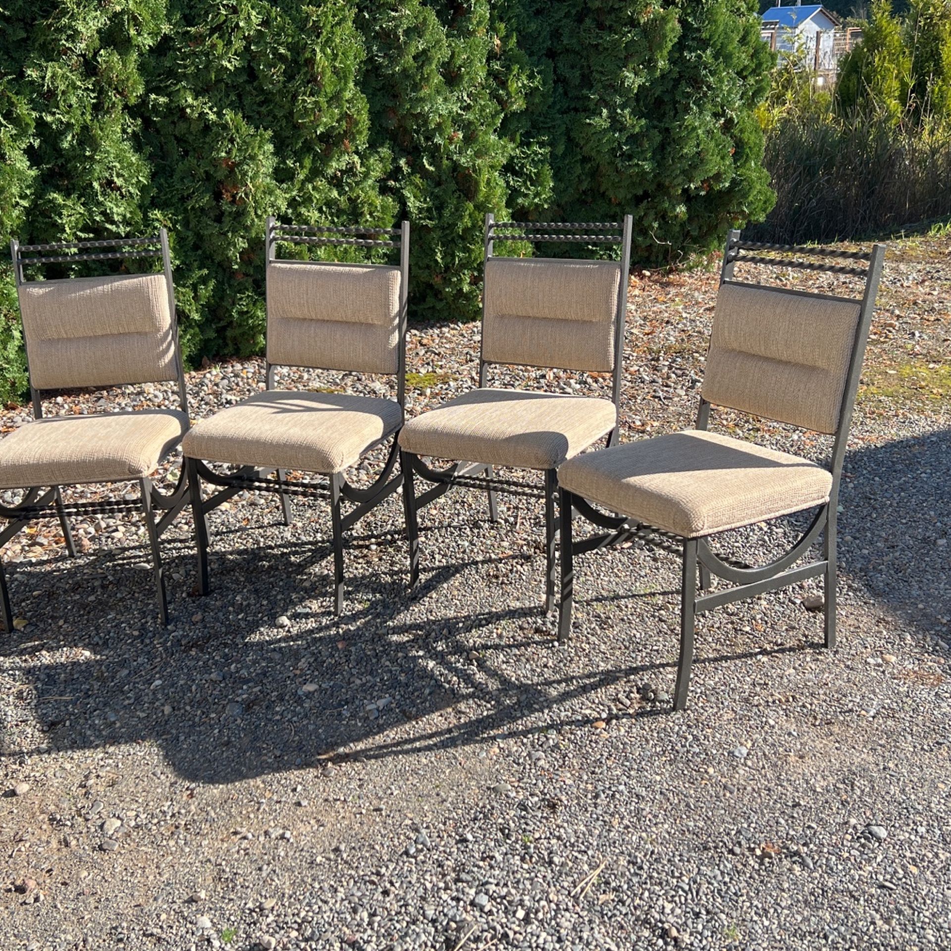 For dining room chairs, no table excellent condition heavy duty rod iron no rips or tears in upholstery. Upholstery is beige in color.