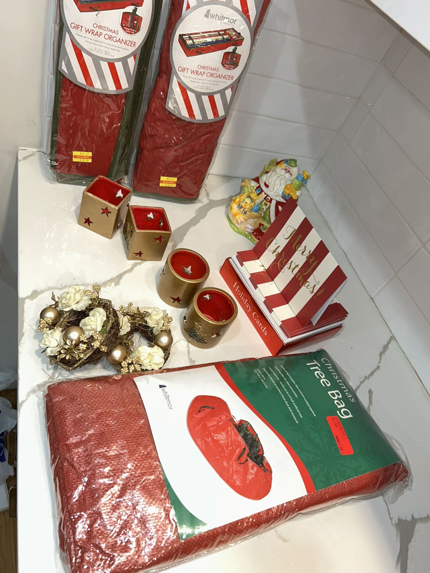 2 circular Christmas tree & stars tea light holder 2 square Christmas tree & stars tea light holder 2 Christmas gift wrap organizer (5x14.5x43in) 2 mini wreaths (white/gold accent) 1 (15 pack of “Merry Christmas” holiday cards w| envelopes ) 1 Christmas Tree bag Items have never been used and remain in original condition.
