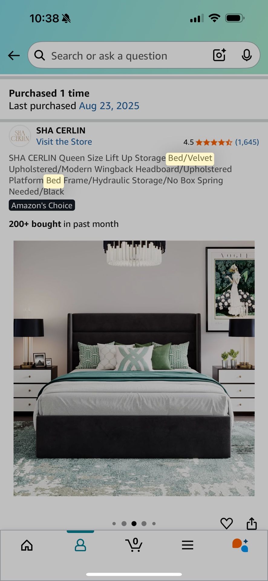 Queen size bed with under storage in black velvet. Purchased on Amazon but changed mind since I found a bed in local furniture store. Too heavy for me to take to return at Amazon.