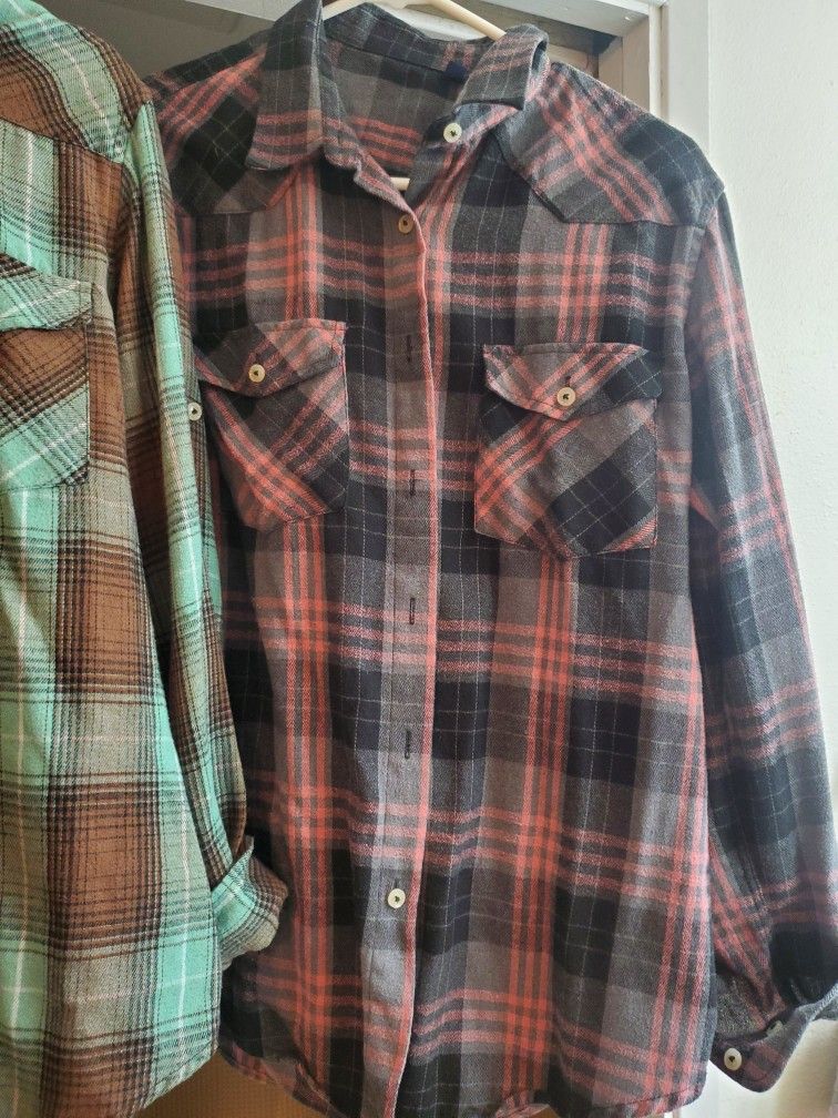 Two boutique women's medium flannel shirts. Pink/black and green/black. Both in good condition, smoke free home. On the heavier side, not thin material.