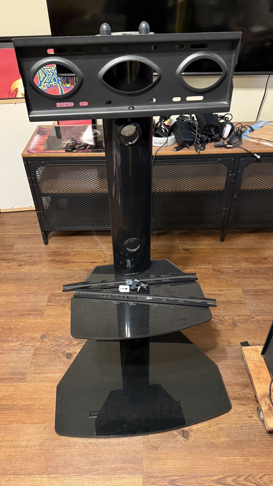 Tv stand with built in cord organizing straps, cord cutouts, 2 hard glass shelves, and heavy base. Can hold up to 55” TVs Item available for pickup only!