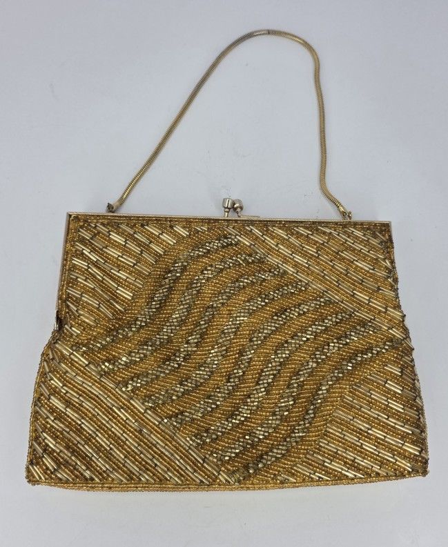 This product is a vintage 1960s Walborg gold glass hand beaded seed bead purse, designed for evening wear. Made in Hong Kong, this original piece embodies the glamor and sophistication of the era. The intricate beading and elegant design make it a perfect accessory for cocktail occasions, adding a touch of luxury to any outfit. The closure is kiss lock and the strap is gold metal. This purse is a rare and stunning addition to any vintage collection, ideal for those who appreciate classic style and timeless beauty. Silk interior, hand sewn, in very good condition. Interior & exterior are in very good clean condition. Measures: 5.25" L x 7.75". Strap is 5.50" inches long.