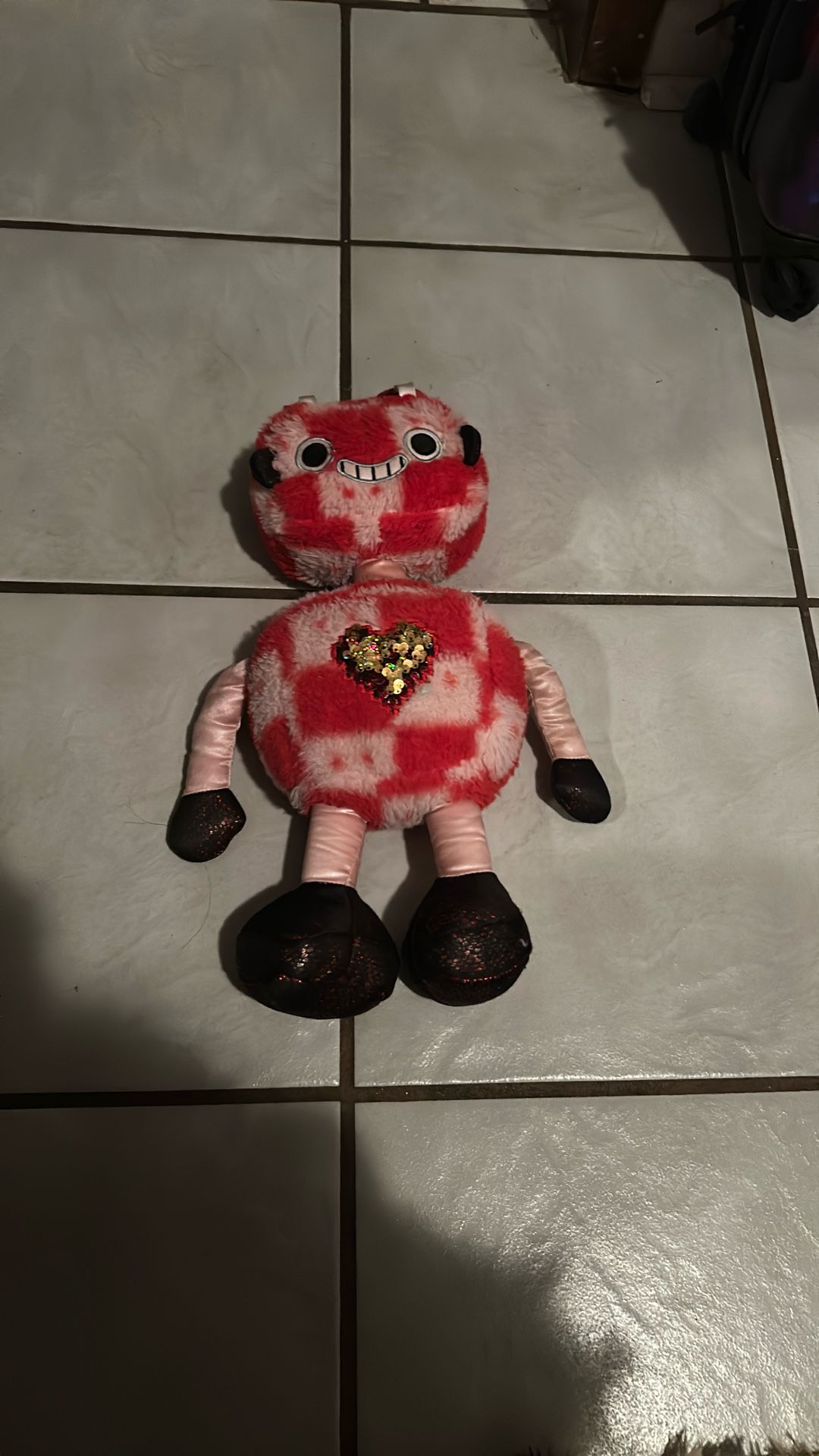 It has 2 small heart on the top of the head and you can change the color of the heart on the middle and it is soft