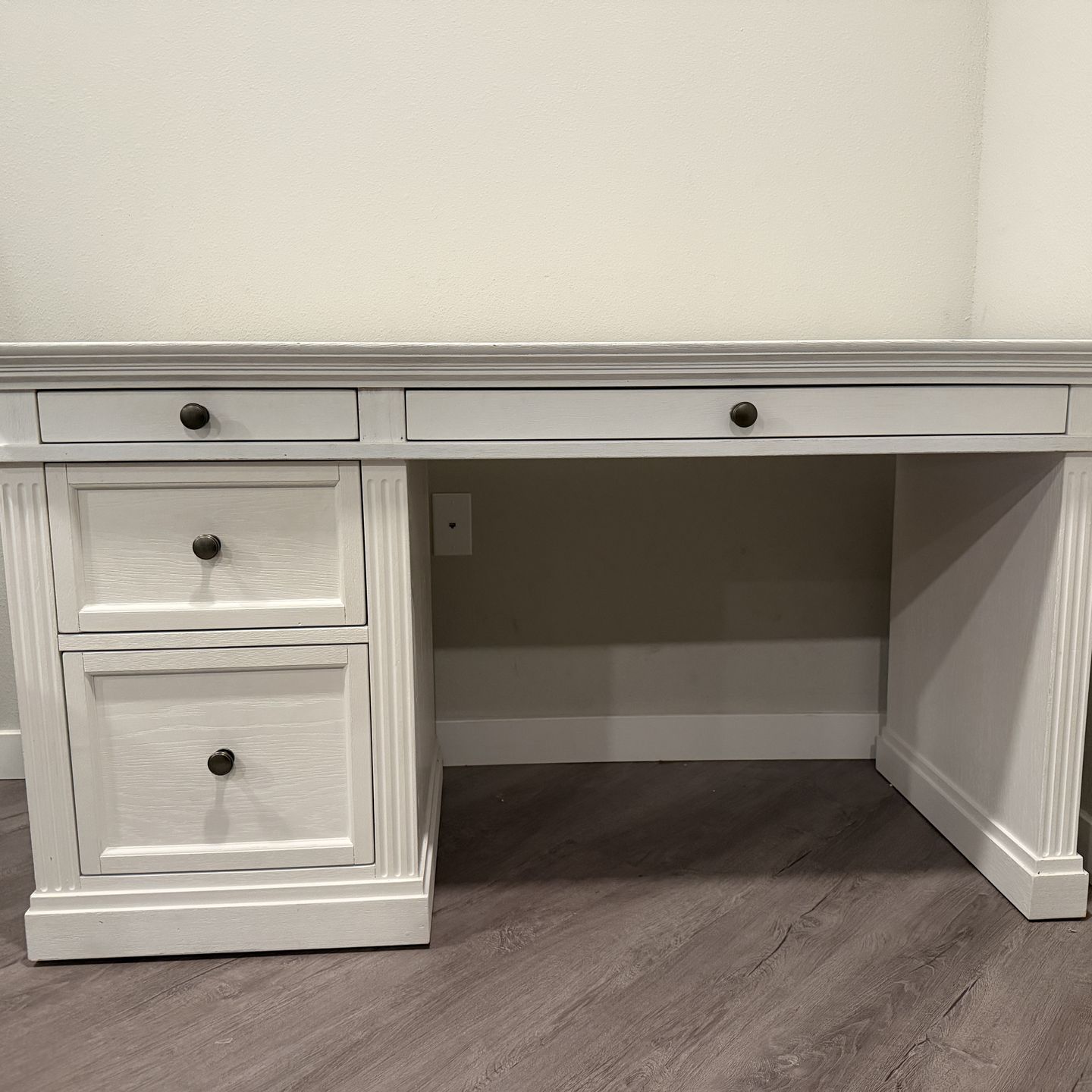 Pottery Barn Livingston Single Cabinet Desk Gently used Pottery Barn writing desk in Montauk White in excellent condition. Accented with Antique Nickel Hardware. Desk features 2 small drawers, 1 large drawer and 1 file drawer. Bottom drawer can hold legal files and is equipped with heavy-duty side-mounted glides. Made of kiln-dried solid meranti wood and veneer and is finished on all sides. This item generally retails for $1,599. Dimensions: 57" l x 24.5" w x 30" h