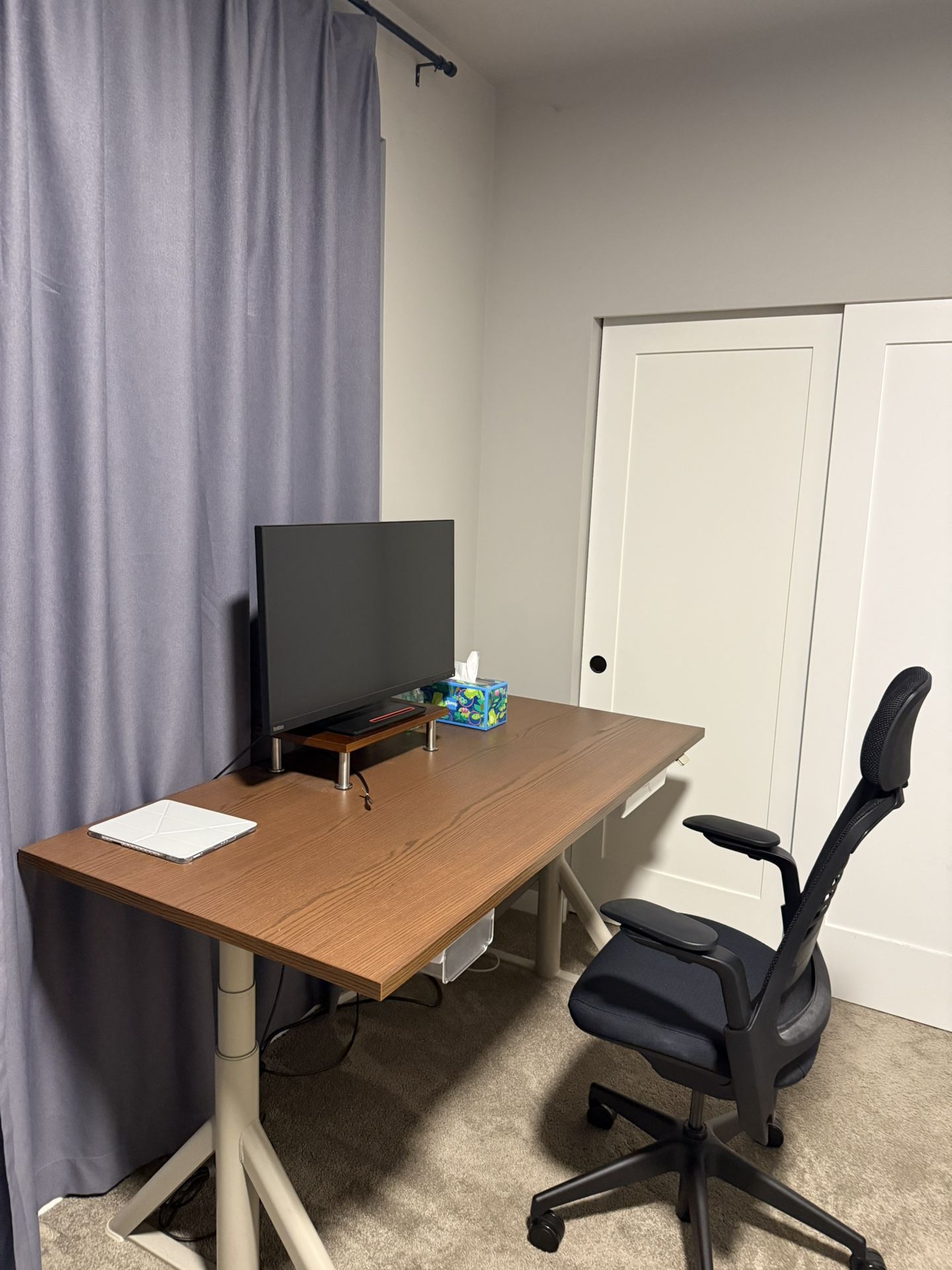 Condition: Excellent (9/10). Lightly used and very well-maintained. No major scratches, dents, or damage. Fully functional. VERY LARGE Table to put everything you need on desk. Features: • Electric height adjustment — Smooth, stable lifting mechanism; perfect for switching between sitting and standing. • Spacious desktop — Large enough for dual monitors, keyboard, speakers, and accessories. • Sturdy frame — Very solid and wobble-free, even when typing while standing. • Built-in cable management net (shown in photos) — Helps keep cables organized and hidden for a cleaner setup. • Modern wood-grain finish — Clean, minimal look that fits well in any home office or bedroom. Includes: Desk, original cable-management net, and all hardware.