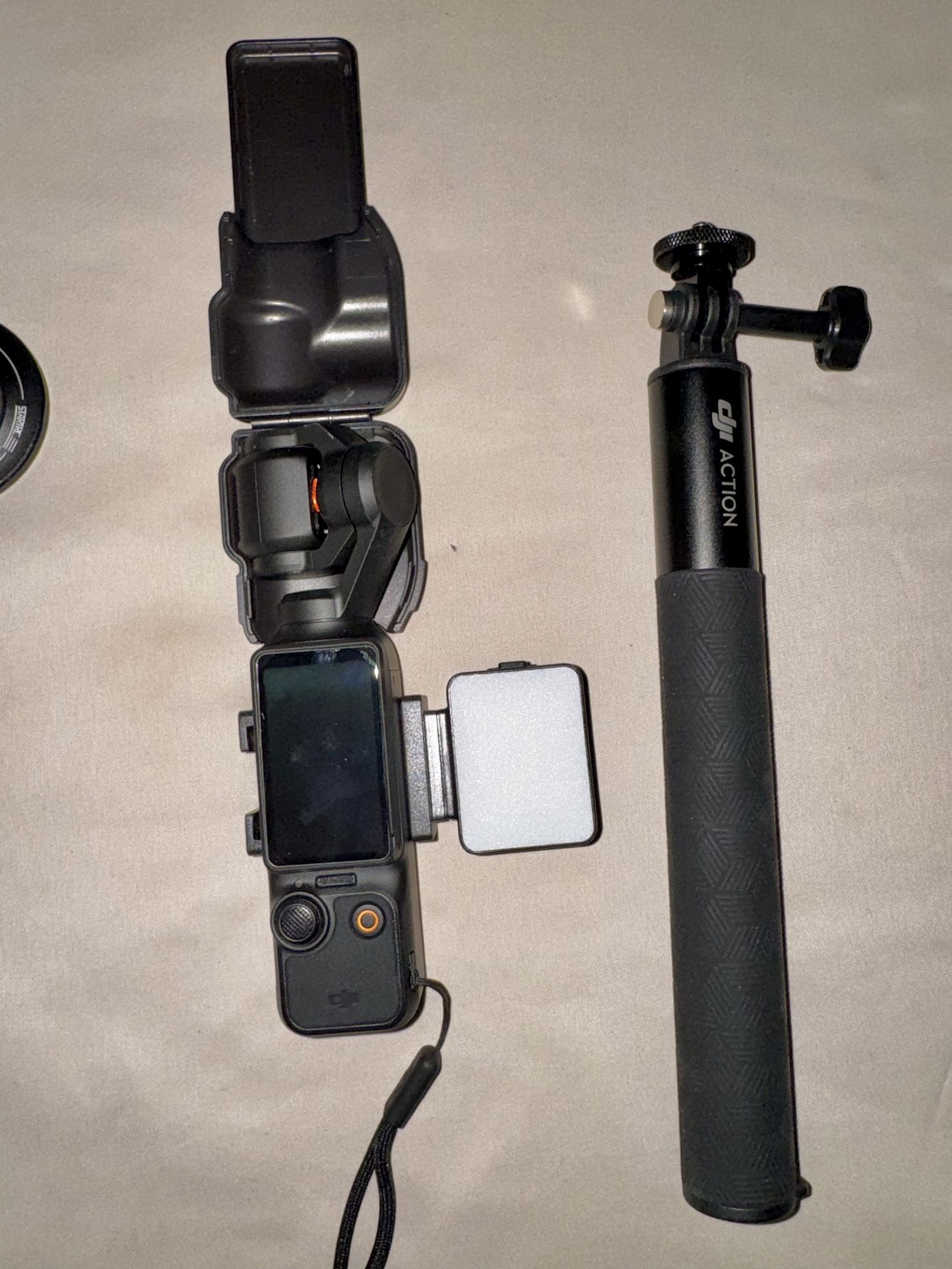 Mic mini set included, with Nike side bag and accessories. Includes 256 sd memory card, ND Filter, screen cover, long DJI action selfie stick, magnet mount and flash light adapter. Charger, extended connector and battery included as well .