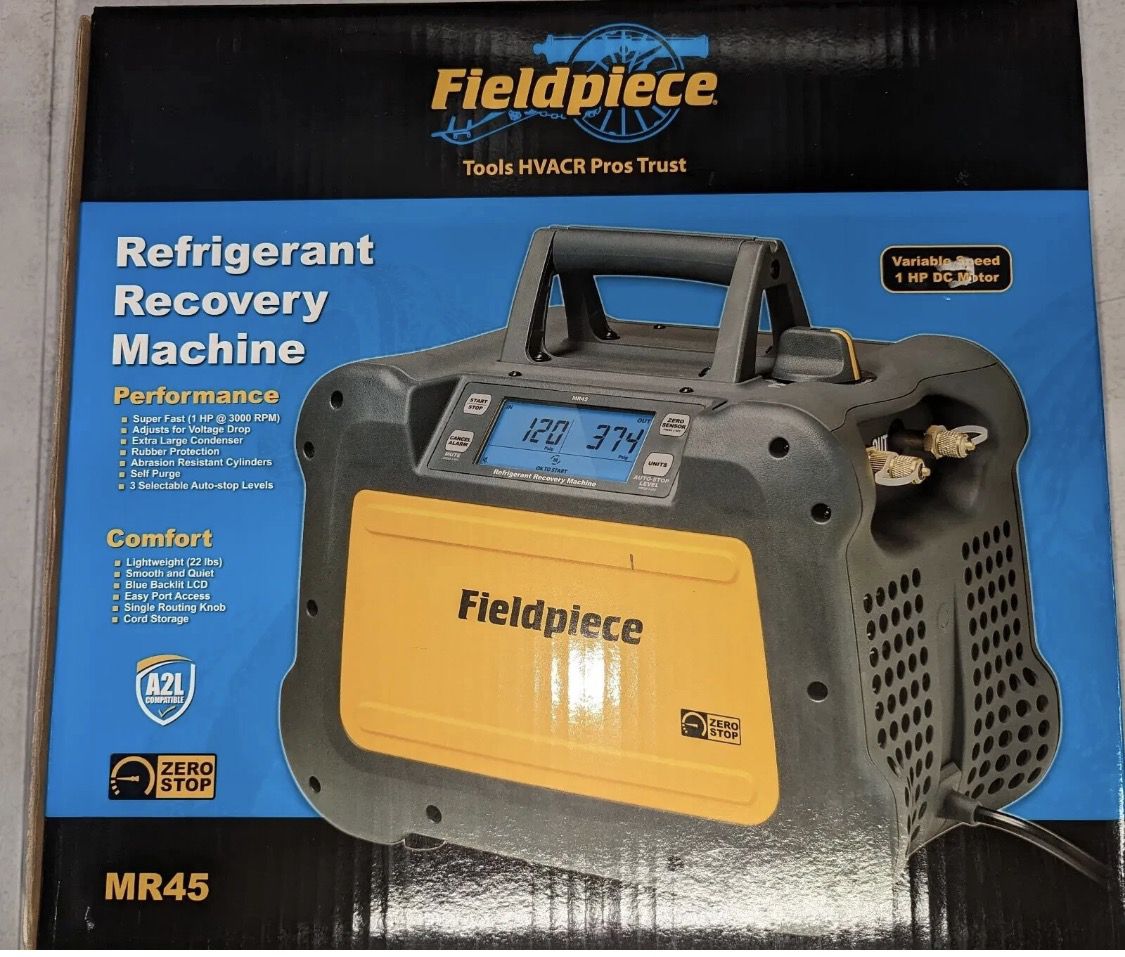 Brand new Fieldpiece MR45 refrigerant recovery machine Never used – ready for the job • Twin-cylinder design for fast recovery • Works with A2L refrigerants • Lightweight and compact • Quiet and efficient operation 💲 $1,100 OBO 📍 Local pickup