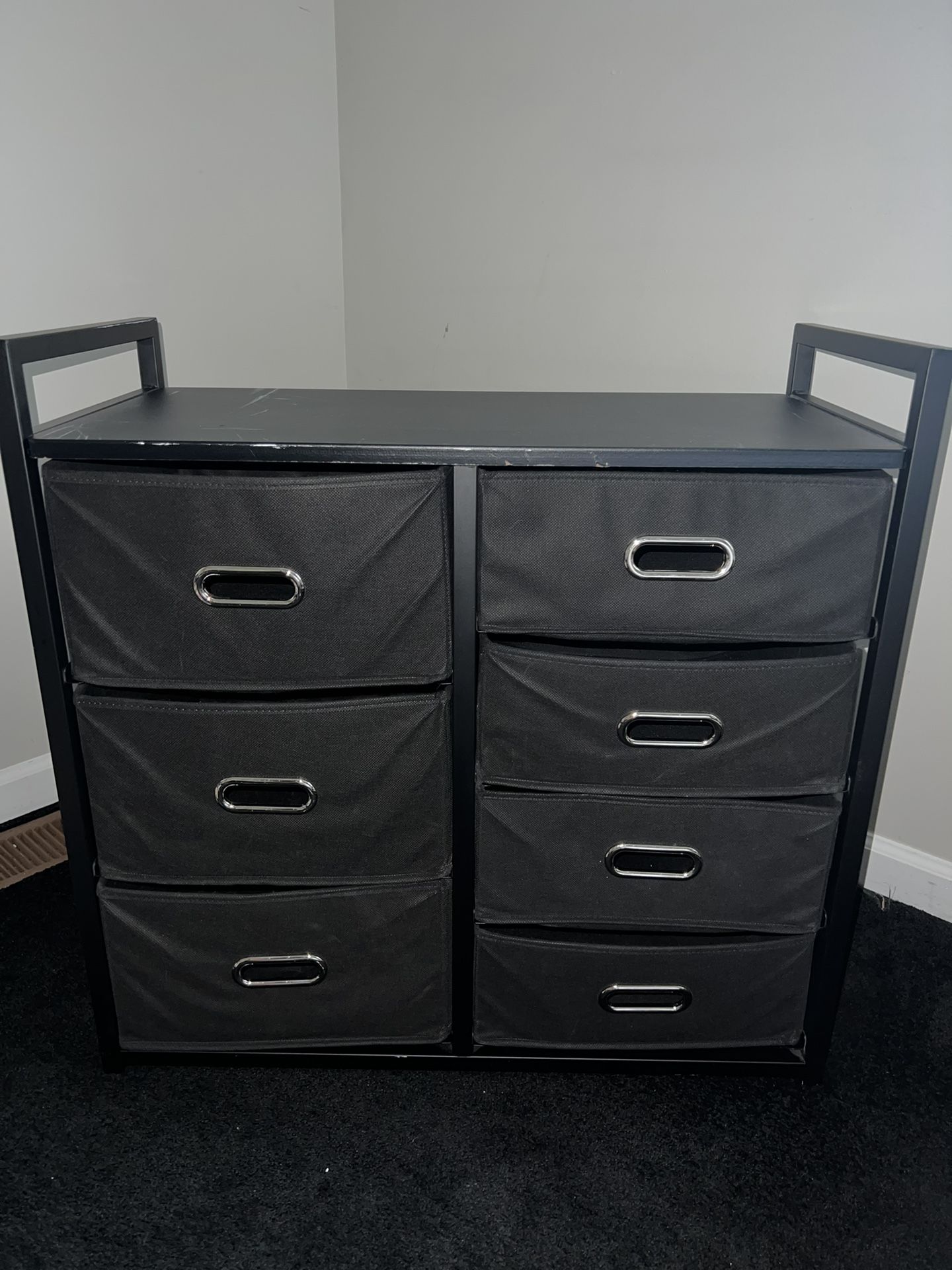 Fairly used, some scratches/wear and tear but works fine. Drawers slide in and out and is great to store shoes,papers different odds and ends