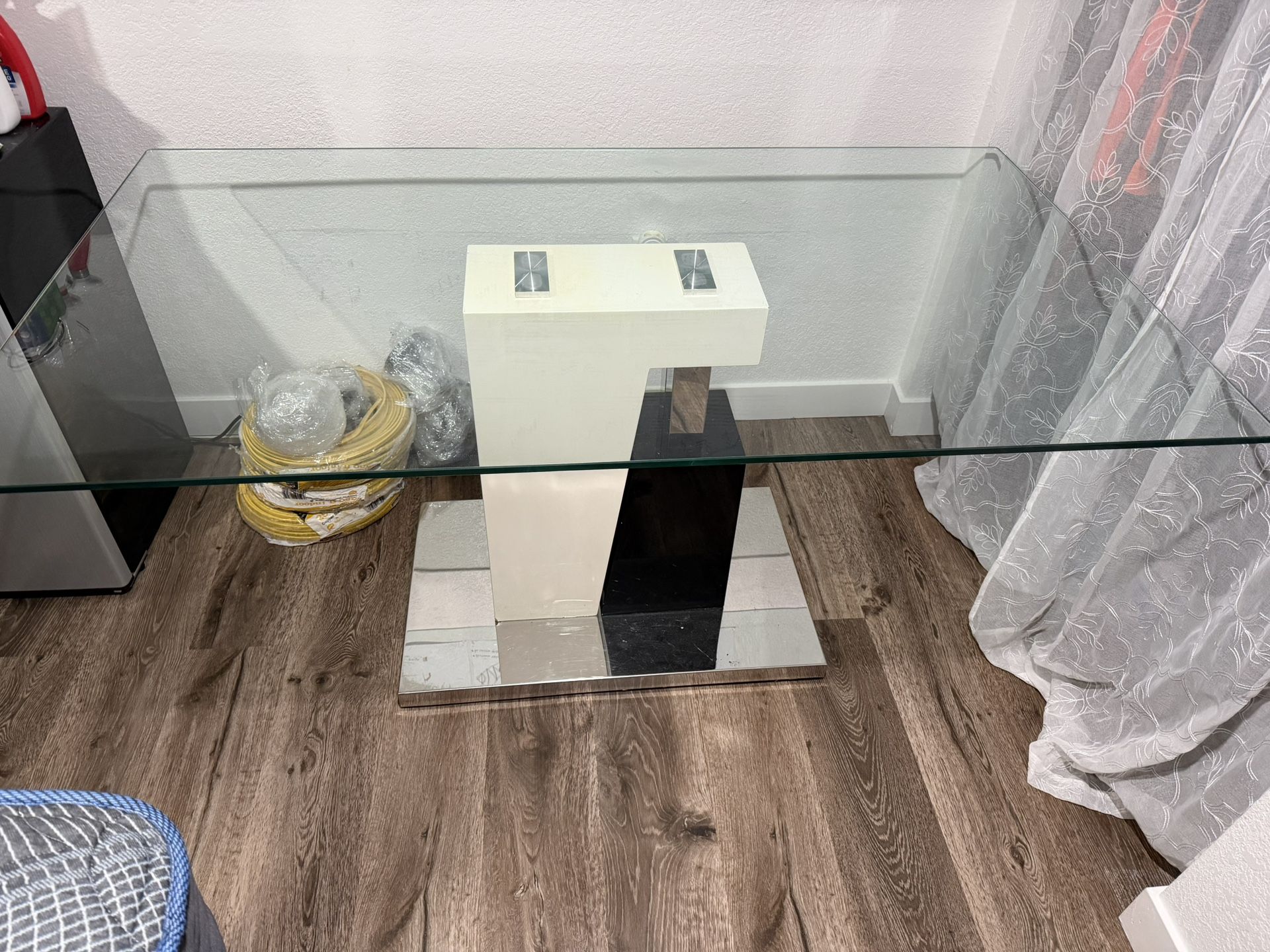 Hermosa mesa de comedor con superficie de vidrio grueso y base moderna en color blanco y negro. Incluye 4 sillas negras con diseño moderno y patas metálicas, muy cómodas y en buen estado. Perfecta para apartamentos o espacios pequeños, fácil de combinar con cualquier decoración.