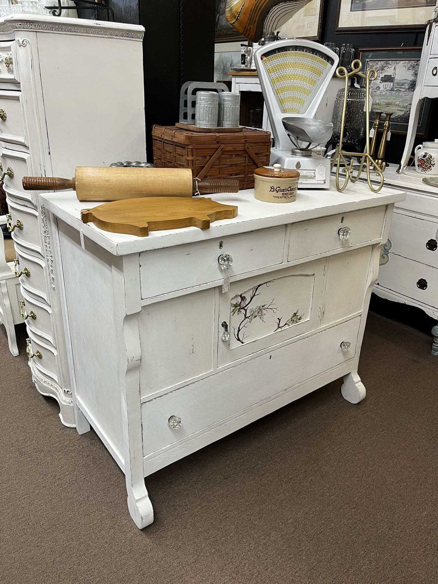 Shabby white painted buffet cabinet with 3 drawers. This can be found in booth B14. See photos for location and other info. Measures about: 46” wide, 21” deep, and 37” tall