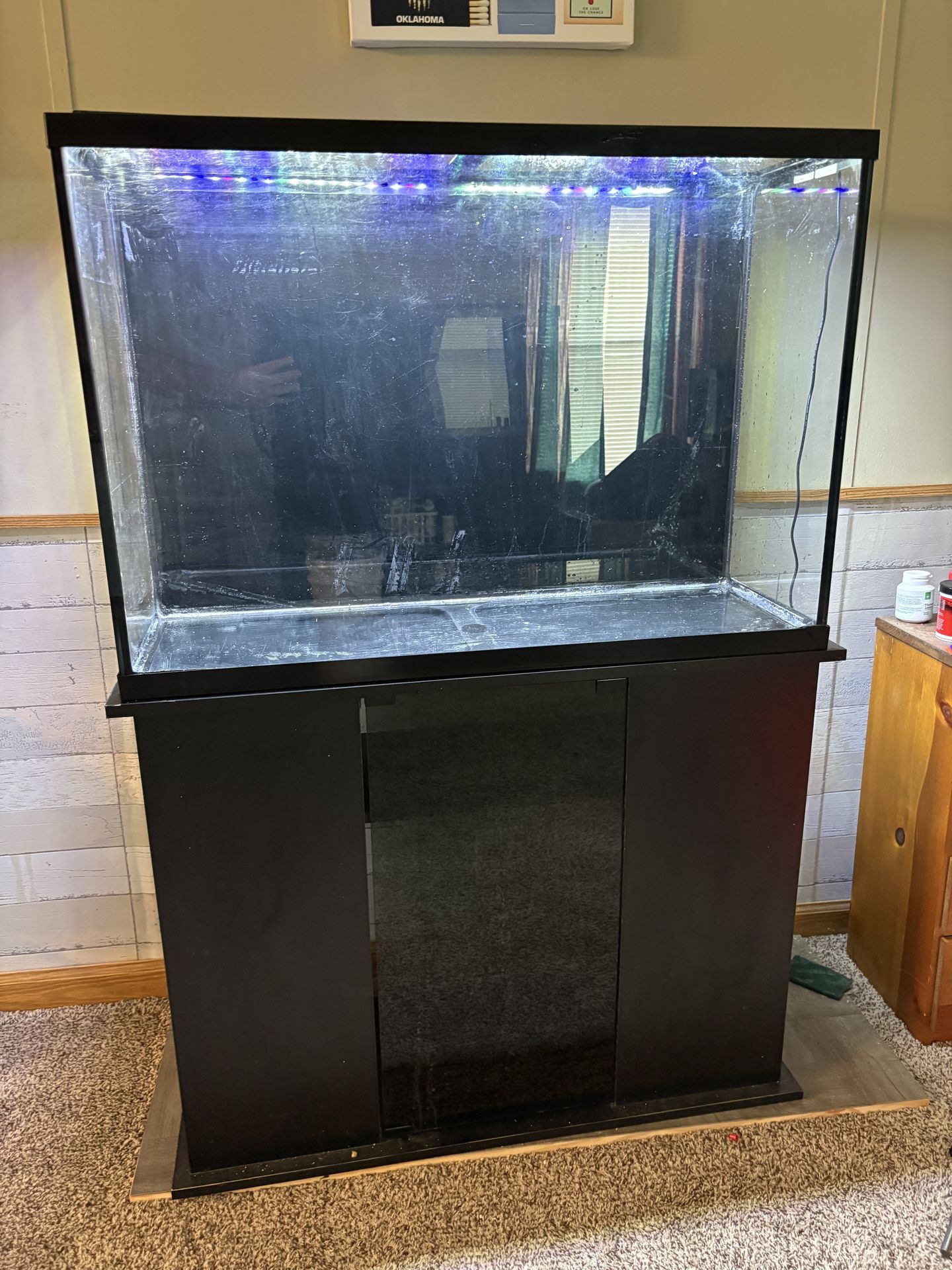 Selling a 45 gallon tall glass aquarium with matching stand. Overall in good used condition and holds water with no leaks. Details: • 45 gallon tall glass tank • Matching stand included • Holds water – no leaks • Minor light scratches on the glass (cosmetic only) • Very mild calcium staining in a few areas • Back of the tank is painted black, which gives a clean look and hides cords/equipment • Stand is in decent shape with a few small cosmetic nicks This is a solid setup and would make a great freshwater or saltwater aquarium. Just needs a rinse and it’s ready to go.