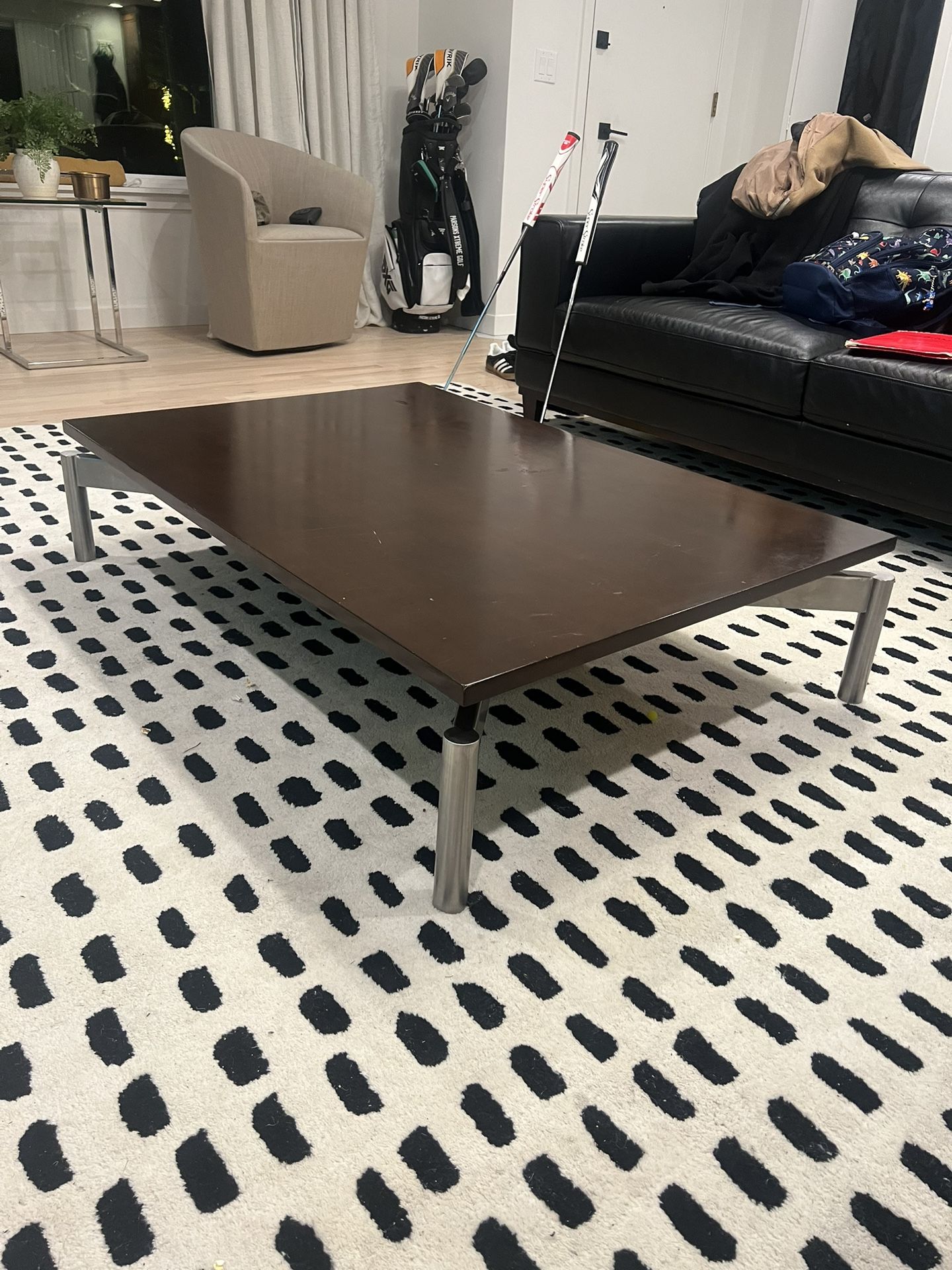 Length 47’ Width 32’ Height 10’ Modern brown wood top with stainless steel legs. High end Scandinavian design (not from ikea)