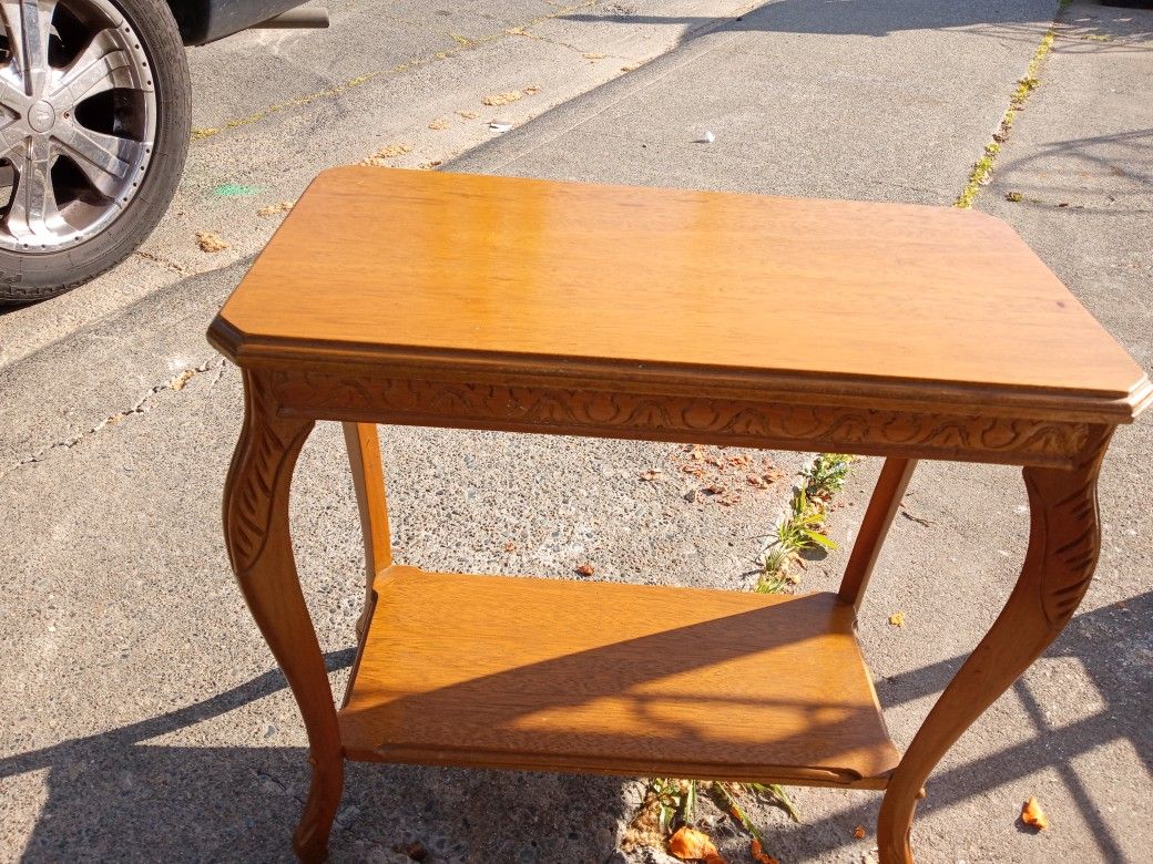 - this is a beautiful vintage Queen and style parley, lamp, or side table - All Wood Construction - it features two tears, beautifully carved legs, and and or needed car design l - measures 24" x 12" x 23"