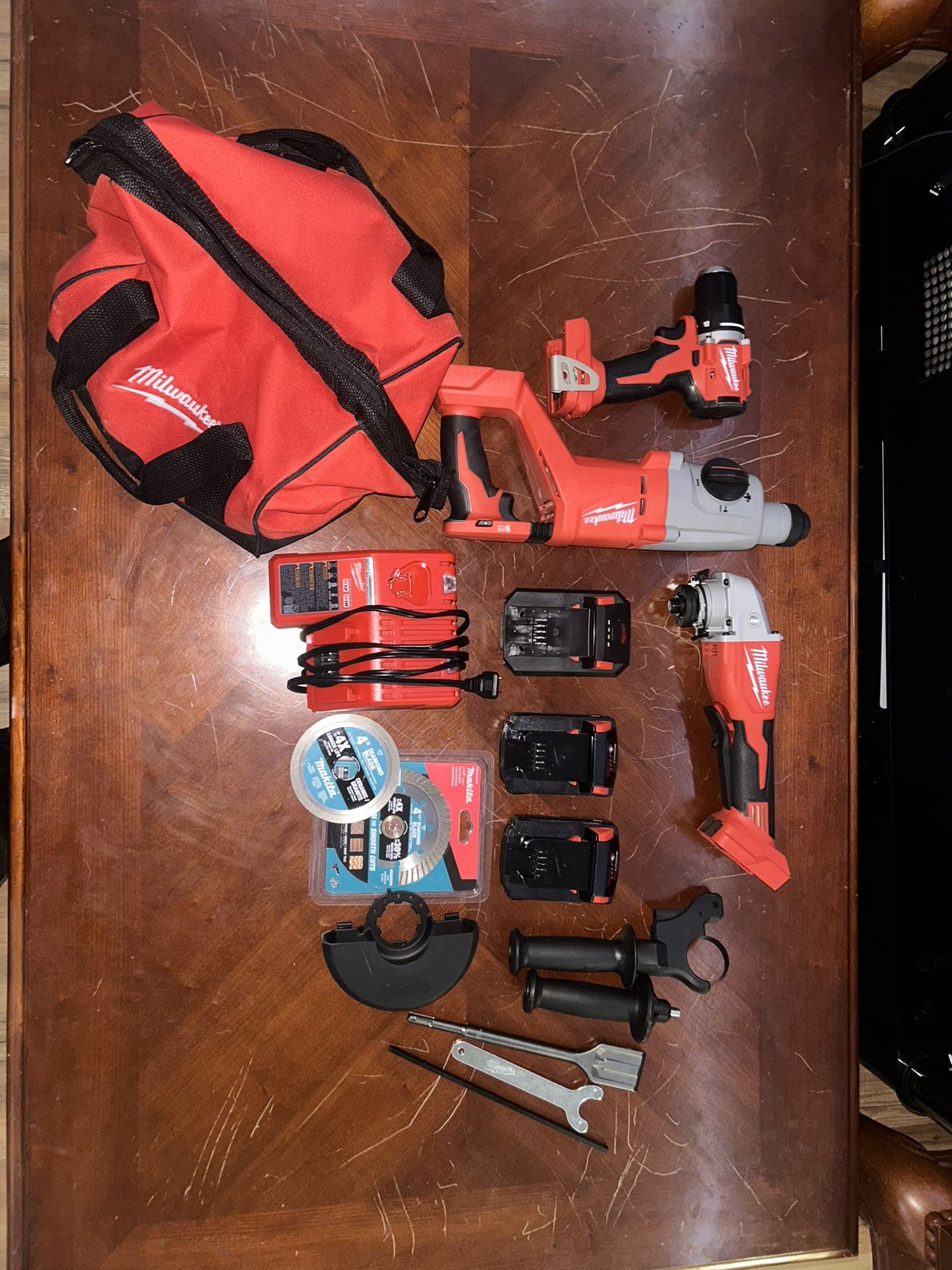 All new Milwaukee tools. Message with your offer. 4.5 inch cordless angle grinder ($129) (Two blades included) ($60) Cordless hammer drill ($179) (Tile removal bit included) ($20) Cordless compact hammer drill/ driver ($129) Battery charger ($50) Two 2.0 batteries ($100) One 6.0 forge high capacity battery ($250) Carrying case/bag for everything Great starter tool kit with the bits, blades, and batteries to get the job done