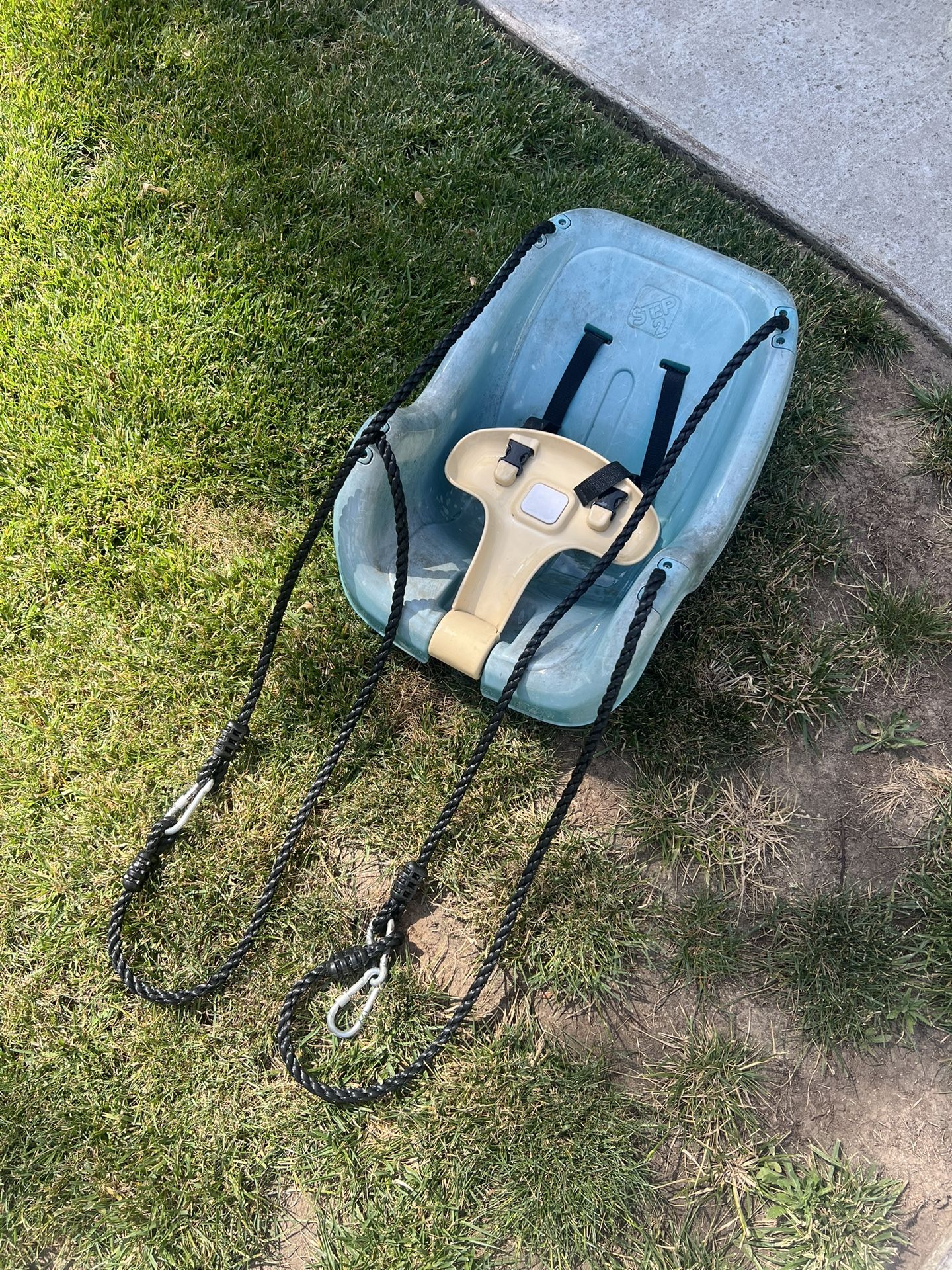 In working order, but definitely could use a fresh coat of paint.. plastic is worn from the sun but ropes and harness/clips in good condition. Could be painted with a cute color combo